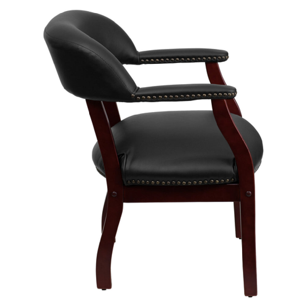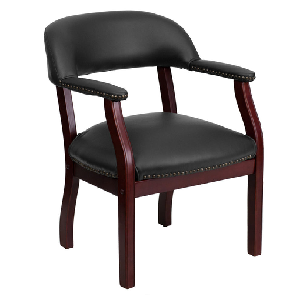 The Flash Furniture B-Z105-BLACK-GG Luxurious Conference Chair is designed with a 250 lb. weight capacity, making it suitable for a variety of professional settings, from corporate offices to boardrooms. This chair features an open back design and contoured cushions, providing both comfort and support during long meetings. The chair is upholstered in durable vinyl, complemented by brass nailhead trimming for a sophisticated look. It is equipped with upholstered straight arms accented with brass nail details, adding a touch of elegance to its design. Built with CA117 fire retardant foam, this chair prioritizes safety without compromising on comfort. The solid hardwood mahogany frame ensures durability and stability, making it a reliable choice for everyday use. Available in black, this conference chair requires assembly and is designed to ship within 24 hours for in-stock items, facilitating quick setup and immediate use. Its combination of style, safety, and functionality makes the Flash Furniture B-Z105-BLACK-GG Luxurious Conference Chair an attractive option for businesses seeking to enhance their meeting spaces with quality seating solutions.