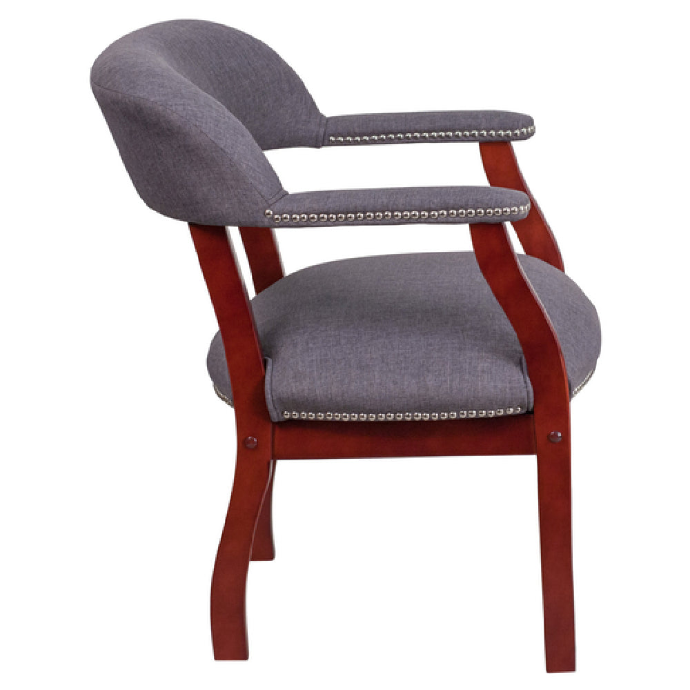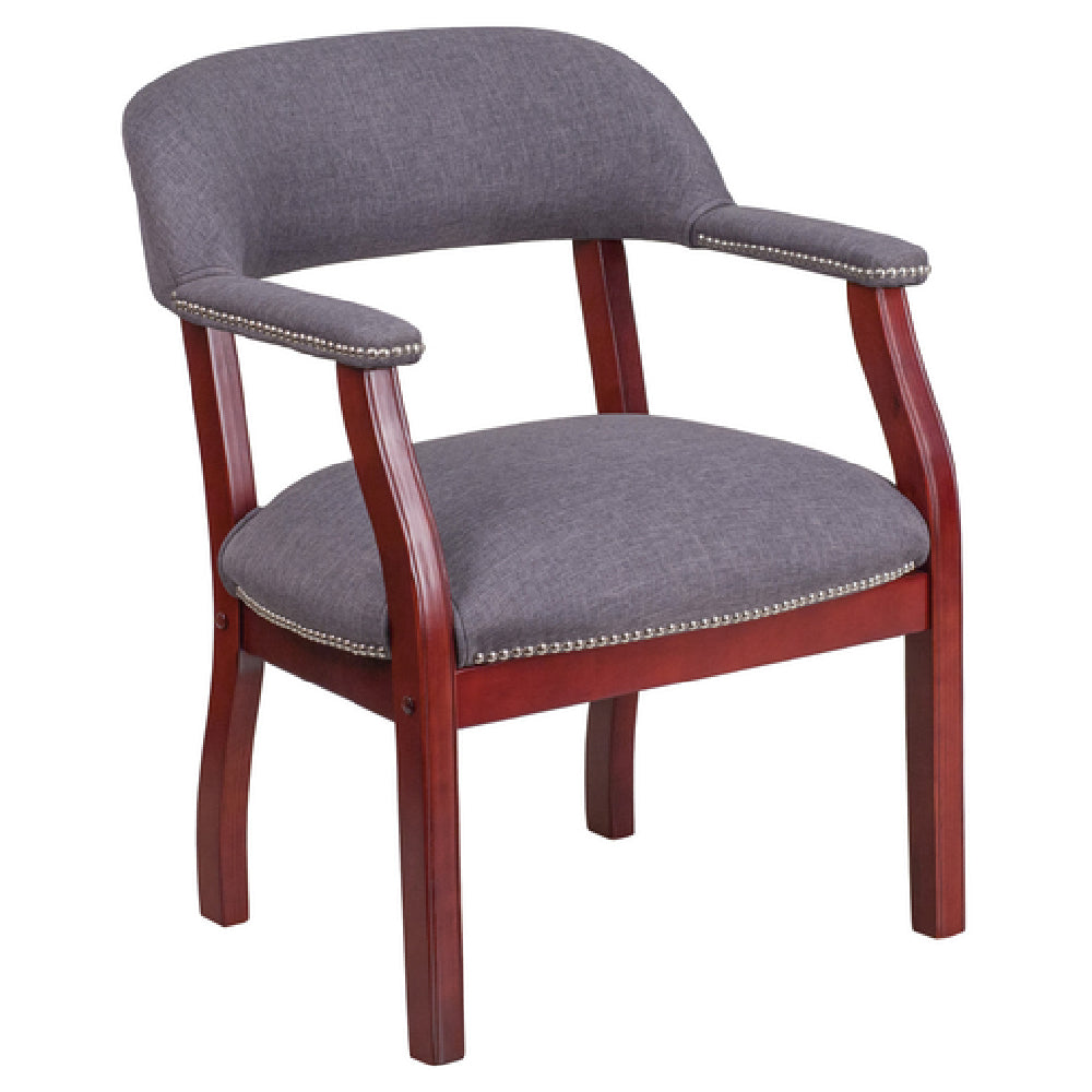 The Flash Furniture B-Z105-GY-GG Luxurious Conference Chair is expertly designed to enhance any business setting with its sophisticated features and robust build. This chair boasts a 250 lb. weight capacity, ideal for accommodating a wide range of users in professional environments. The chair's open back design promotes airflow and comfort, while the contoured cushions provide ergonomic support for extended periods of sitting. Its polyester upholstery is not only durable but also adds a sleek, modern aesthetic, complemented by elegant silver nailhead trimming. The upholstered straight arms, accented with silver nail details, offer additional comfort and style. Safety and quality are prioritized with CA117 fire retardant foam, ensuring peace of mind for office administrators. Supported by a solid hardwood mahogany frame, this chair combines durability with a touch of classic elegance. The chair is finished in a neutral gray, allowing it to seamlessly integrate into various office decors. Assembly is required, but the process is straightforward, making it a practical choice for businesses. In-stock items typically ship within 24 hours, facilitating prompt delivery for time-sensitive projects. This chair is a versatile addition to conference rooms, executive offices, and meeting spaces, providing a blend of comfort, safety, and sophisticated design.