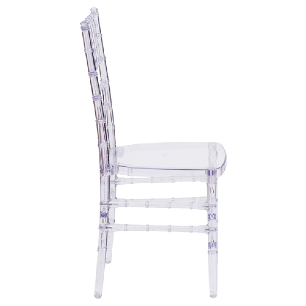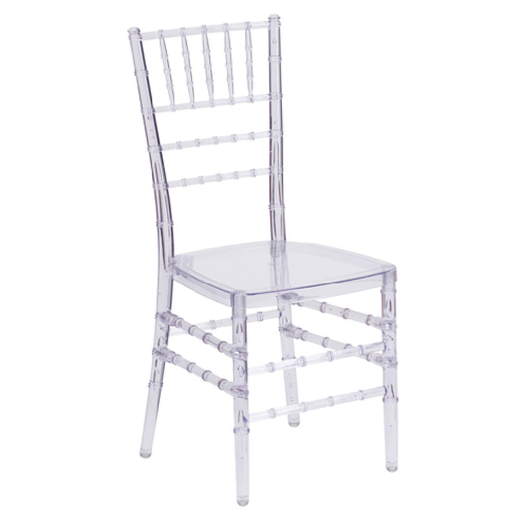 The Flash Furniture BH-ICE-CRYSTAL-GG Flash Elegance Stacking Chiavari Chair 1100 Lb. Weight Capacity stands out in the realm of versatile seating solutions, offering a blend of robust functionality and aesthetic appeal. With an impressive 1100 lb. weight capacity, this chair is engineered to meet the demands of rigorous commercial environments, ensuring durability and reliability. Crafted from polycarbonate, the crystal ice finish adds a touch of elegance, making it suitable for both indoor and outdoor settings. Its wobble-free construction guarantees stability, while the clear floor glides facilitate seamless movement across various surfaces without causing damage. A key feature is its ability to stack up to 10 chairs high, optimizing storage space and enhancing convenience for event planners and venues. This chair is UV resistant, making it an ideal choice for outdoor events where protection from the elements is crucial. The product ships fully assembled, ensuring immediate usability upon delivery, and in-stock items usually ship within 24 hours, contributing to efficient logistics management. The Flash Elegance Stacking Chiavari Chair is a premium option for those seeking dependable and stylish seating solutions across banquet halls, conference centers, and event spaces.