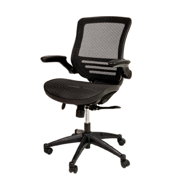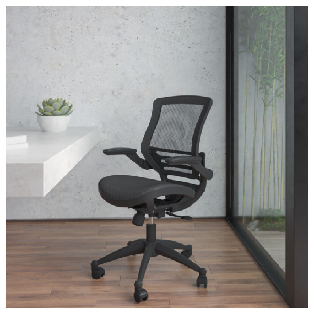 The Flash Furniture BL-8801X-BK-GG Warfield Executive Swivel Chair stands out in the executive seating market with its combination of ergonomic design and durable construction. With an adjustable height ranging from 37 inches to 41 inches, this mid-back chair caters to a variety of desk heights and user preferences. It supports a robust weight capacity of 300 pounds, ensuring strong performance in diverse office environments. The chair features a transparent black mesh back and seat, enhancing airflow and comfort during extended periods of use. Its built-in lumbar support and 2-to-1 locking synchro tilt adjustments offer personalized ergonomic benefits, promoting better posture and reducing fatigue. The tilt tension adjustment knob allows users to fine-tune the resistance of the tilt mechanism, adding to the chair's customization options. Pneumatic seat height adjustment ensures smooth and effortless modifications. The padded flip-up arms provide additional comfort and can be conveniently stowed away when not needed. Supported by a heavy-duty black nylon base with dual-wheel casters, the chair offers excellent stability and mobility across various surfaces. Designed for quick availability, in-stock items typically ship within 24 hours, making the Flash Furniture BL-8801X-BK-GG Warfield Executive Swivel Chair a reliable choice for both corporate offices and home workspaces.