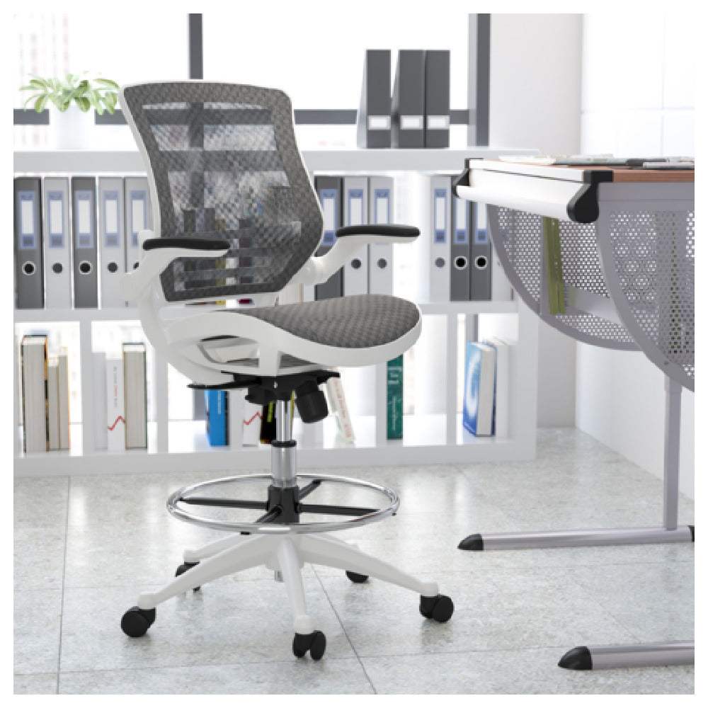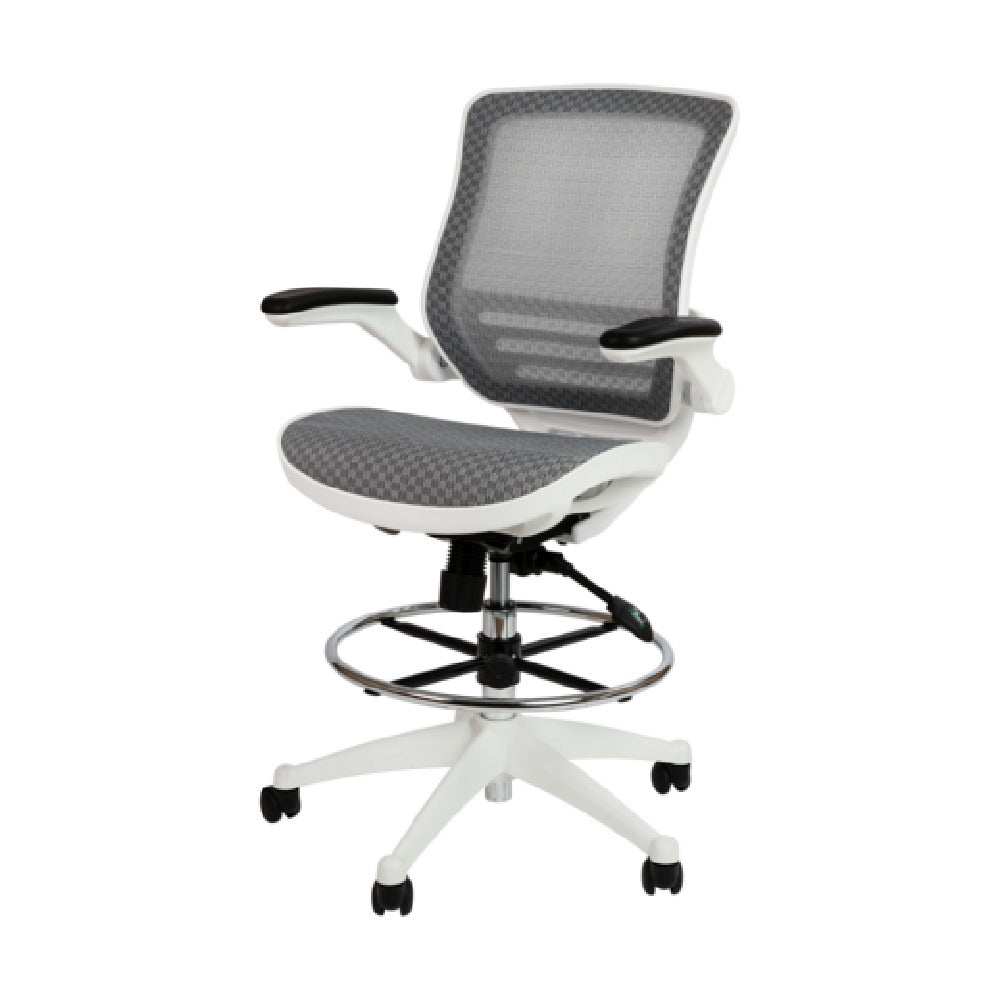 The Flash Furniture BL-LB-8801X-D-GR-WH-GG Waylon Drafting Swivel Chair is a versatile seating solution tailored for professionals in creative and technical fields. Boasting a mid-back design for ergonomic support, the chair features a transparent gray mesh back and seat for enhanced breathability and modern aesthetic appeal. Unique technical specifications include a seat height adjustable from 42-1/2" to 50" using pneumatic adjustment technology, catering to various drafting table heights and user preferences. The built-in lumbar support ensures long-term comfort, while the 2-to-1 locking synchro tilt adjustment and tilt tension adjustment knobs provide customizable reclining positions. The chair is equipped with padded flip-up arms for added convenience and flexibility, ideal for those needing extra workspace mobility. A height-adjustable chrome foot ring offers additional foot support, enhancing comfort during prolonged sitting periods. Constructed with a heavy-duty white nylon base, the chair is designed for durability and stability, supported by dual-wheel casters for smooth movement. This drafting chair is an exceptional choice for architects, engineers, and artists, offering a balance of comfort, style, and functional design to accommodate the precise needs of professionals in creative industries.