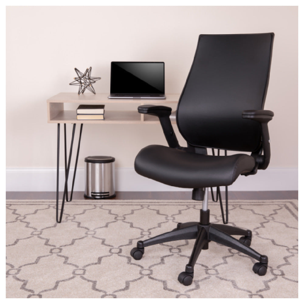 The Flash Furniture BL-LB-8809-LEA-GG Waylon Swivel Office Chair 40-1/4" - 44-1/4" Adjustable Height is a versatile seating option designed for various office environments, accommodating users with its 250 lb. weight capacity. This chair features a high-back design and a molded foam seat, providing comfort and support for long hours of work. Equipped with built-in lumbar support, the chair promotes ergonomic seating, enhancing user productivity and reducing strain. The tilt lock mechanism and tilt tension adjustment knob allow for customizable reclining positions, catering to individual preferences. Safety is prioritized with the CA117 fire retardant foam, ensuring peace of mind. The chair's functionality is enhanced by the swivel seat and pneumatic seat height adjustment, allowing seamless movement and height customization between 40-1/4" and 44-1/4". The height adjustable padded arms further contribute to user comfort. Constructed with a heavy-duty nylon base and dual wheel casters, the chair ensures stability and easy mobility across different floor surfaces. Upholstered in Leathersoft, it offers a sophisticated, durable finish in classic black. Assembly is required, making it suitable for diverse market segments seeking a blend of comfort, adjustability, and style in an office chair.