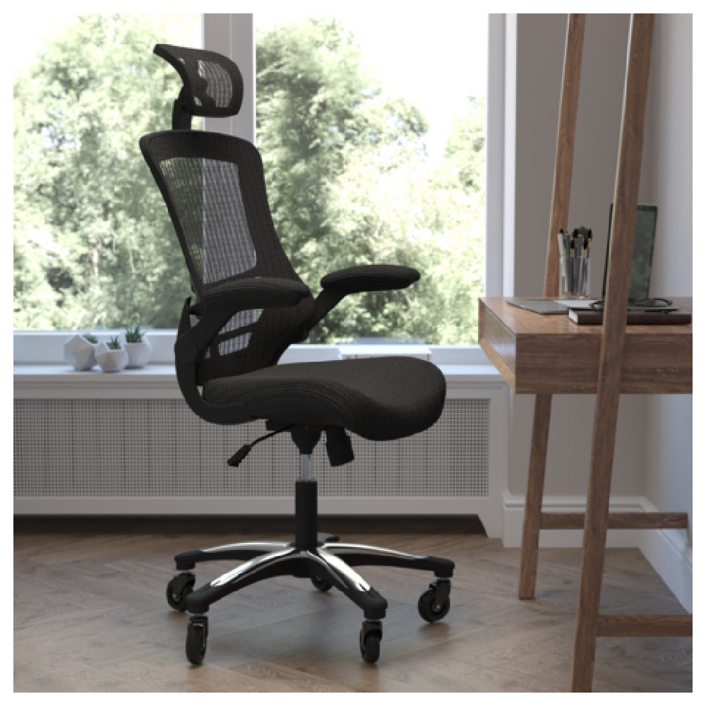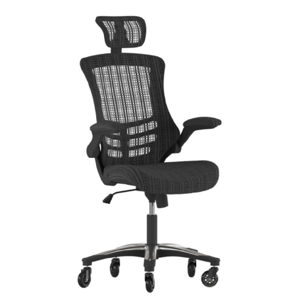 The Flash Furniture BL-X-5H-RLB-GG Kelista Executive Swivel Office Chair is a sophisticated seating solution designed for executive settings, offering a blend of comfort, style, and functionality. This executive chair features a high back design and an adjustable height range from 47-1/2" to 52-1/2", catering to various user preferences and ergonomic needs. With a weight capacity of 250 lb, it provides robust support for a wide range of users. The chair is equipped with an adjustable headrest and a ventilated mesh back that promotes airflow, ensuring comfort during extended sitting periods. Its padded mesh upholstered waterfall seat aids in reducing leg strain, while the built-in lumbar support enhances proper posture. The tilt lock mechanism and tilt tension adjustment knob allow users to customize their seating position for optimal comfort. Padded flip-up arms add to the chair's versatility, adapting to different workspace requirements. For ease of mobility, the chair features ball-bearing roller style wheels. Available in black, this office chair requires assembly, making it a practical choice for corporate environments, home offices, and professional workspaces that demand both durability and ergonomic support.
