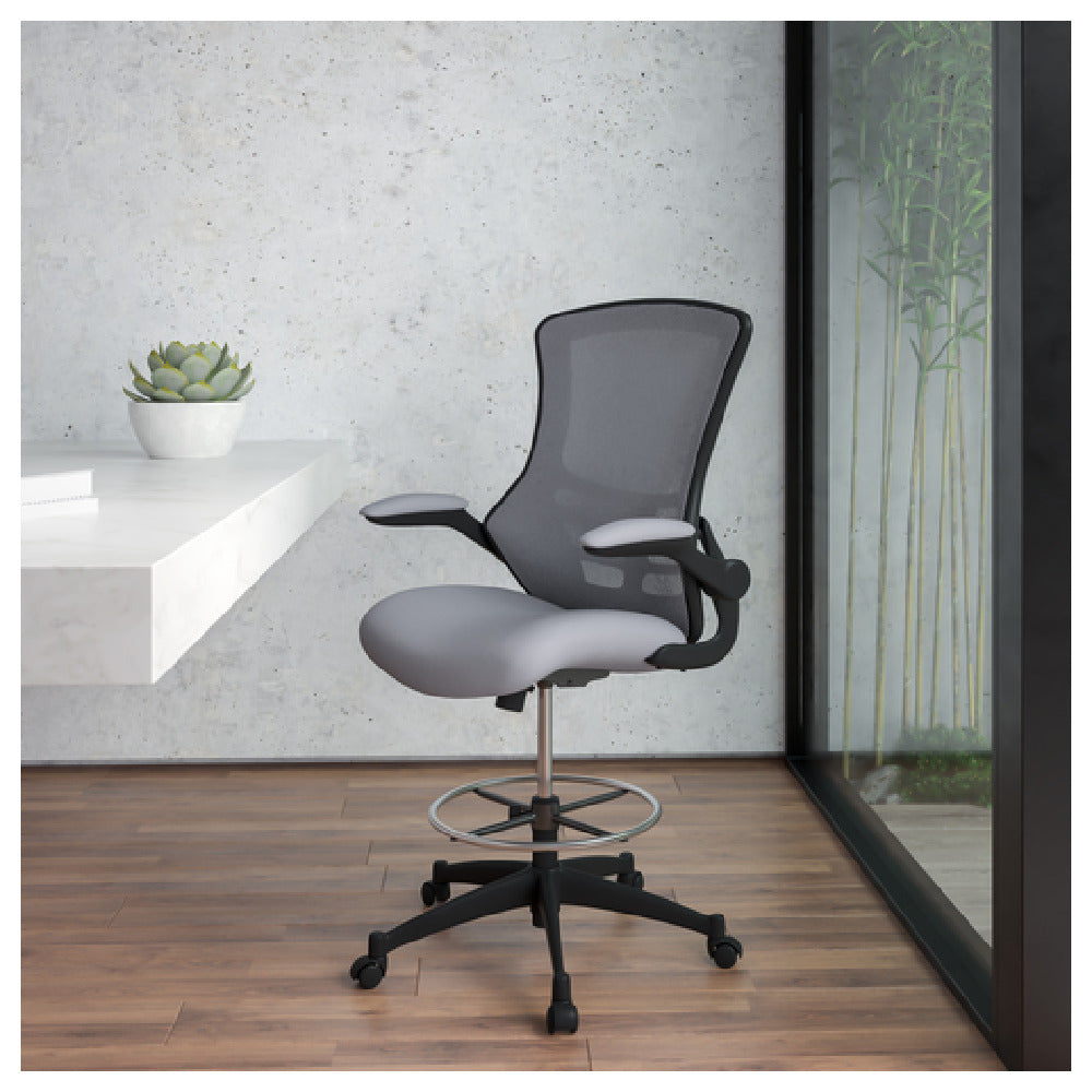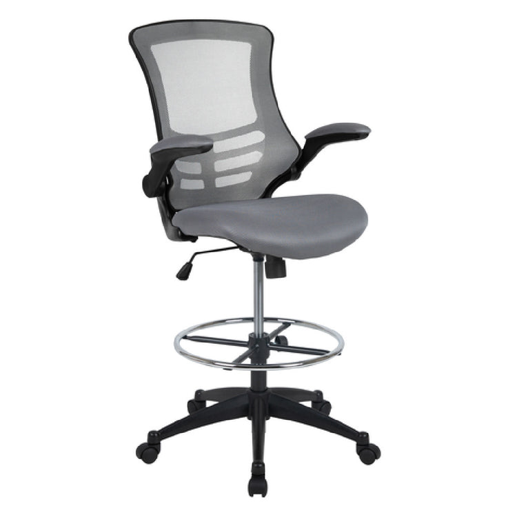The Flash Furniture BL-X-5M-D-DKGY-GG Swivel Drafting Chair is a premier seating solution, offering a versatile height adjustment from 43-1/4" to 50-3/4", making it suitable for diverse professional environments such as design studios, architectural firms, and technical drawing offices. With a substantial weight capacity of 250 lbs, this chair ensures robust support. Its mid-back design, coupled with a ventilated mesh back, provides optimal airflow, enhancing user comfort during extended usage. The padded mesh upholstered waterfall seat is engineered to promote better circulation, significantly reducing fatigue. Integral lumbar support underscores the chair's ergonomic focus, while the tilt lock mechanism and tilt tension adjustment knob allow for personalized seating positions. The padded flip-up arms add flexibility, easily accommodating different workspace needs. Equipped with CA117 fire retardant foam, the chair meets rigorous safety standards. An adjustable chrome foot ring enhances user stability and comfort, and the heavy-duty black nylon base with dual-wheel casters ensures smooth mobility. Available in dark gray, this chair requires assembly and offers swift shipping within 24 hours of order placement for items in stock. Its combination of practical features and durable construction makes it a reliable choice for professionals seeking both functionality and style.