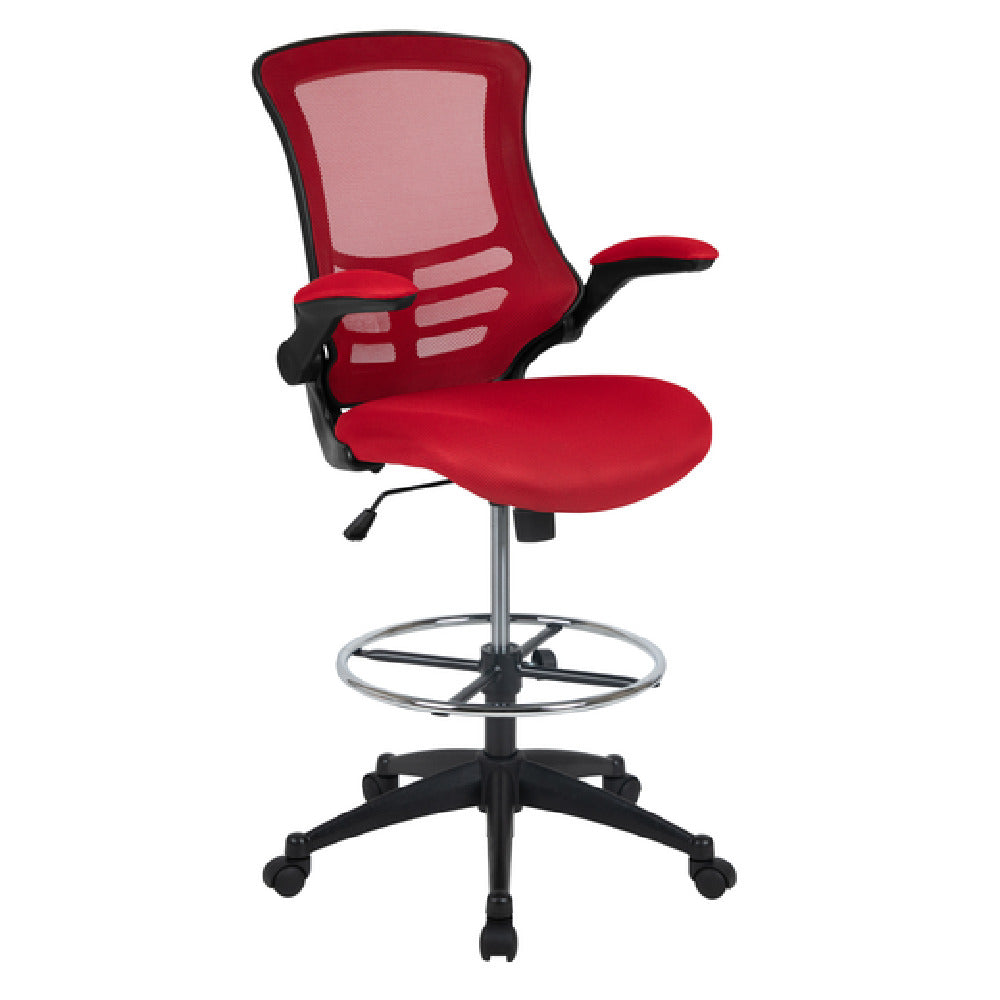 The Flash Furniture BL-X-5M-D-RED-GG Swivel Drafting Chair 43-1/4" to 50-3/4" Adjustable Height presents a versatile seating solution designed for professional environments such as design studios, laboratories, and creative workspaces. With an adjustable height range from 43-1/4" to 50-3/4", this chair caters to a variety of counter and desk heights, providing ergonomic comfort for users. It supports a weight capacity of up to 250 lbs, ensuring durability and stability. The chair's mid-back design features a ventilated mesh back for enhanced airflow, complemented by a padded mesh upholstered waterfall seat that promotes better posture and reduces leg strain. Built-in lumbar support enhances comfort, making it ideal for long working hours. The chair is equipped with a tilt lock mechanism and tilt tension adjustment knob for personalized seating angles, while padded flip-up arms offer additional flexibility. An adjustable chrome foot ring provides lower body support, and a heavy-duty black nylon base with dual wheel casters ensures mobility. The chair incorporates CA117 fire retardant foam for safety, and its vibrant red color adds an aesthetic appeal to any workspace. Assembly is required, and in-stock items typically ship within 24 hours, making it a practical and efficient choice for various professional settings.