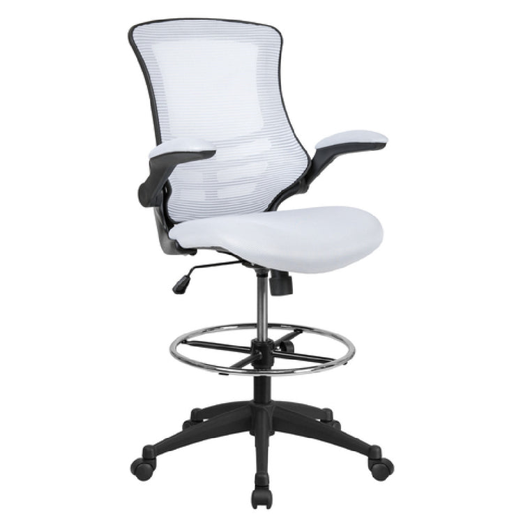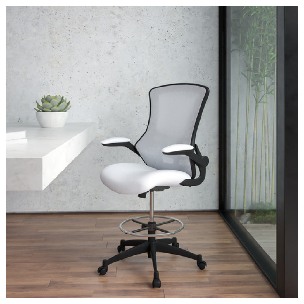 The Flash Furniture BL-X-5M-D-WH-GG Swivel Drafting Chair is a versatile seating solution with an adjustable height range from 43-1/4 inches to 50-3/4 inches, making it suitable for various professional environments such as studios, laboratories, and offices. Designed to accommodate up to 250 pounds, this chair features a mid-back design with a ventilated mesh back to enhance breathability and comfort for prolonged usage. The padded mesh upholstered waterfall seat promotes ergonomic seating, reducing pressure on the legs. For personalized comfort, the chair is equipped with a built-in lumbar support, a tilt lock mechanism, and a tilt tension adjustment knob. The padded flip-up arms offer additional versatility, allowing users to switch between tasks with ease. Safety is prioritized with the inclusion of CA117 fire retardant foam. The chair's adjustable chrome foot ring supports proper leg positioning. Built with a heavy-duty black nylon base and dual wheel casters, it offers stability and mobility across different floor types. The chair's sleek white finish complements modern decor, and assembly is required. Typically, in-stock items are shipped within 24 hours, ensuring prompt delivery for immediate use in various industry settings where adjustable and ergonomic seating is essential.