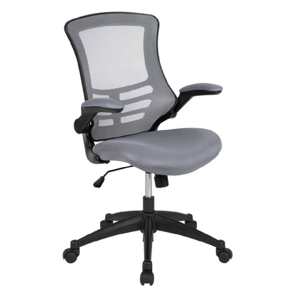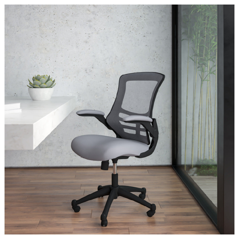 The Flash Furniture BL-X-5M-DKGY-GG Swivel Task Chair is a versatile office seating solution designed for comfort and functionality with an adjustable height ranging from 37-1/2" to 41-1/4". This chair supports a weight capacity of up to 250 lbs, catering to a wide span of users. The mid-back design is complemented by a ventilated mesh back, enhancing airflow to reduce heat buildup during extended periods of sitting. It features a padded upholstered waterfall seat that aids in reducing pressure on the legs, ensuring comfort during long hours of use. The chair includes built-in lumbar support, promoting healthy posture and decreasing the risk of back strain. It also offers a tilt lock mechanism and a tilt tension adjustment knob, allowing users to customize the chair's recline to their preference. The padded flip-up arms offer additional support and can be moved out of the way when needed. Safety is a priority with CA117 fire retardant foam used in its construction. The chair rests on a heavy-duty black nylon base equipped with dual wheel casters for easy mobility across workspaces. Finished in dark gray, and requiring assembly, the Flash Furniture BL-X-5M-DKGY-GG is typically ready to ship within 24 hours, making it a reliable choice for home or office use.