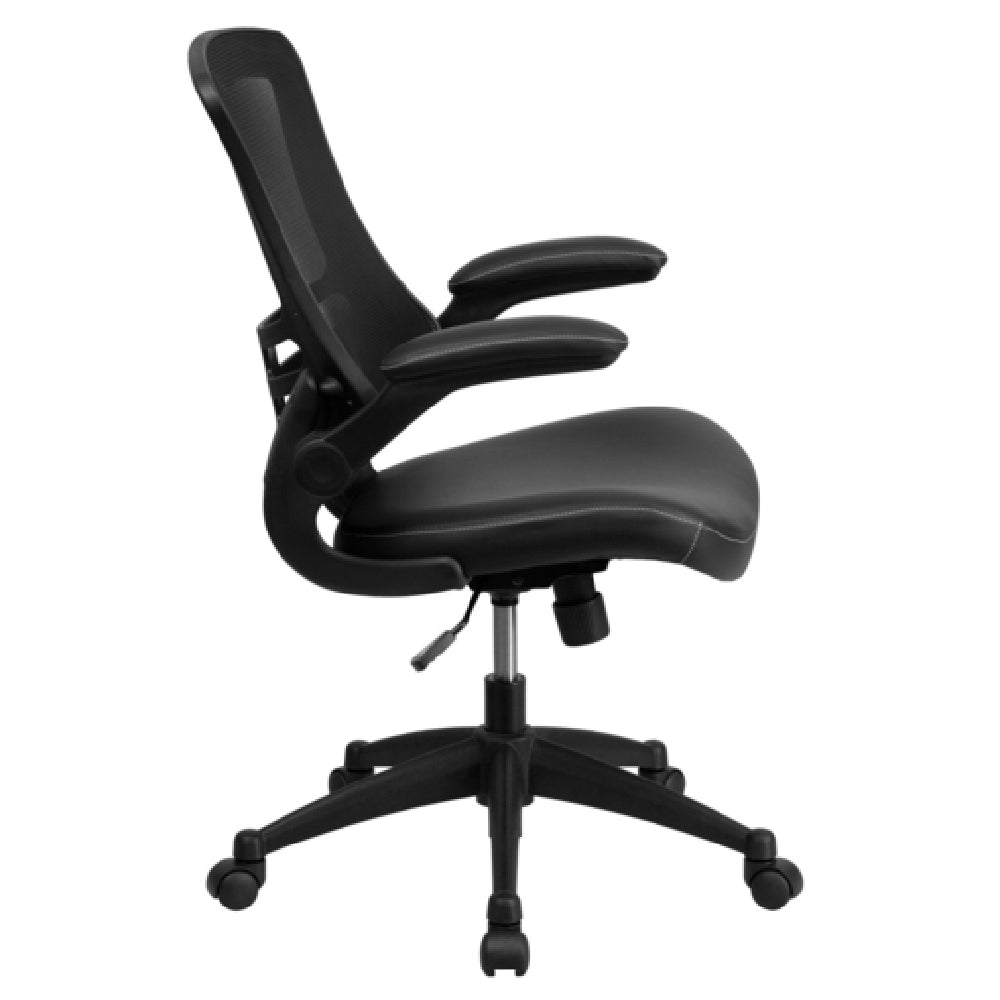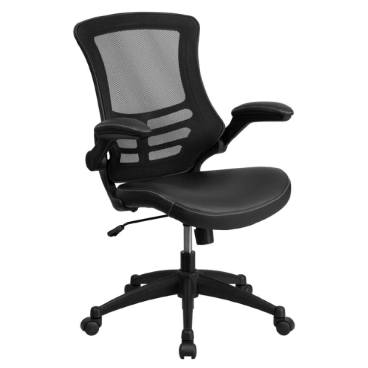 The Flash Furniture BL-X-5M-LEA-GG Swivel Task Chair - 37-1/2" to 41-1/4" Adjustable Height - is designed to deliver ergonomic comfort and functionality for diverse work environments. This chair features a mid-back design, making it suitable for office or home offices, providing essential support for users. It boasts a ventilated mesh back that enhances breathability, ensuring comfort during extended use. The seat is upholstered with LeatherSoft material, combining leather and polyurethane for added softness and durability, and features a waterfall edge to reduce pressure on the legs. Built-in lumbar support aids posture and minimizes back strain. The chair includes a tilt lock mechanism and a tilt tension adjustment knob, allowing users to customize their seating position. Padded flip-up arms offer additional support and can be adjusted or moved out of the way as needed. With a weight capacity of up to 250 lb, it suits various body types. The heavy-duty black nylon base and dual wheel casters provide stability and ease of movement. The CA117 fire retardant foam enhances safety. This chair requires assembly and is available for quick shipping, usually within 24 hours. The Flash Furniture task chair is a versatile choice for those seeking comfort and adjustability in their seating solutions.