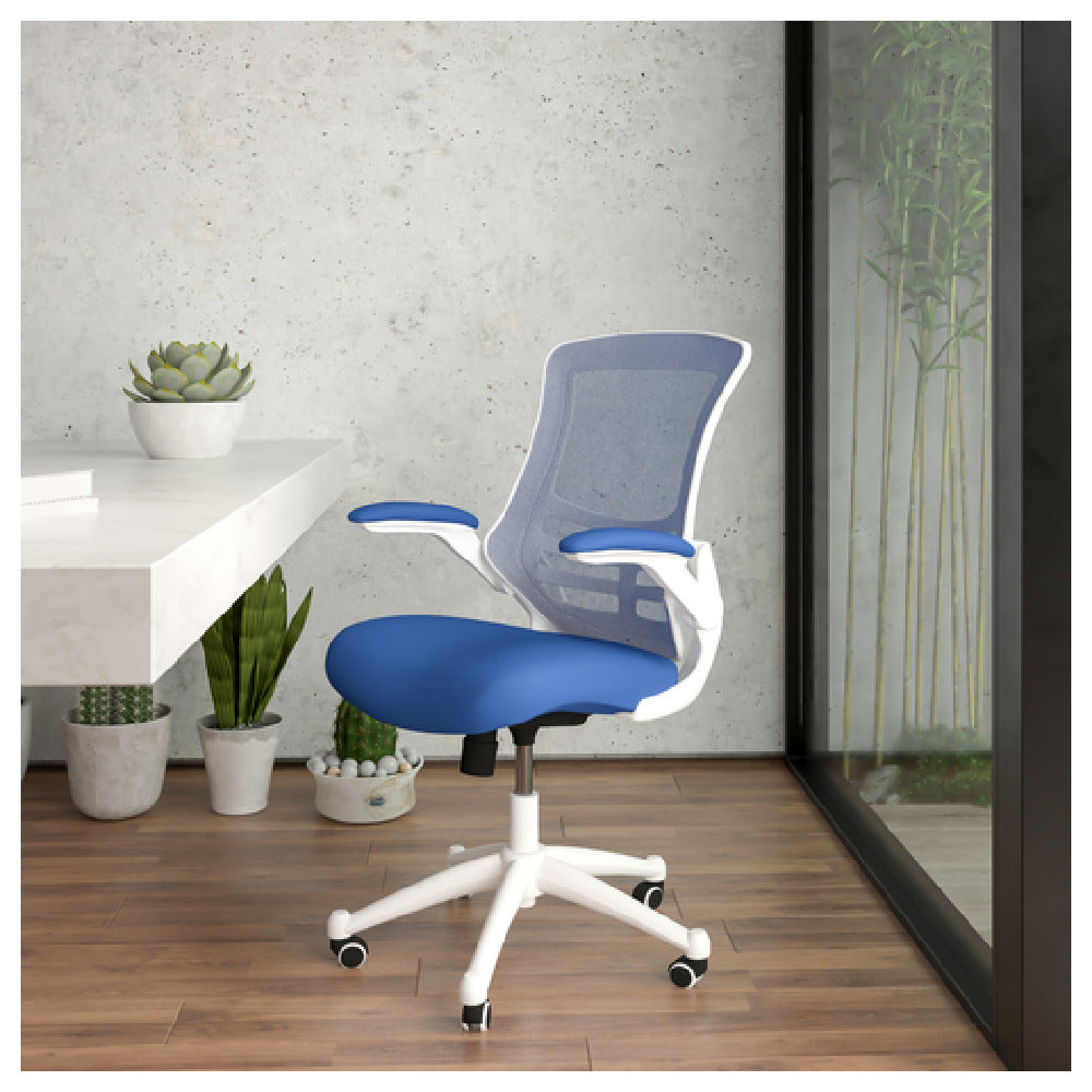 Flash Furniture BL-X-5M-WH-BLUE-GG Swivel Task Chair 37-1/2" to 41-1/4" Adjustable Height is a versatile seating solution designed for both home and office environments. With an adjustable height ranging from 37-1/2" to 41-1/4", this chair accommodates users of varying heights, enhancing comfort and ergonomics. It supports a weight capacity of up to 250 lb., making it a robust choice for diverse user profiles. The mid-back design, complemented by a ventilated mesh back, promotes airflow, providing a cool and comfortable seating experience. Key features include a padded upholstered waterfall seat and built-in lumbar support, which together offer superior ergonomic benefits. The chair is equipped with a tilt lock mechanism and a tilt tension adjustment knob, allowing users to customize their seating angle for optimal posture support. Further enhancing functionality, the chair boasts padded flip-up arms for convenience and flexibility. Safety and durability are prioritized with the inclusion of CA117 fire retardant foam and a heavy-duty white nylon base. Mobility is ensured with dual wheel casters, facilitating easy movement within any workspace. Available in an attractive blue color, this chair requires assembly upon receipt, with in-stock items typically shipping within 24 hours.
