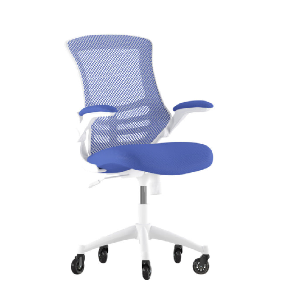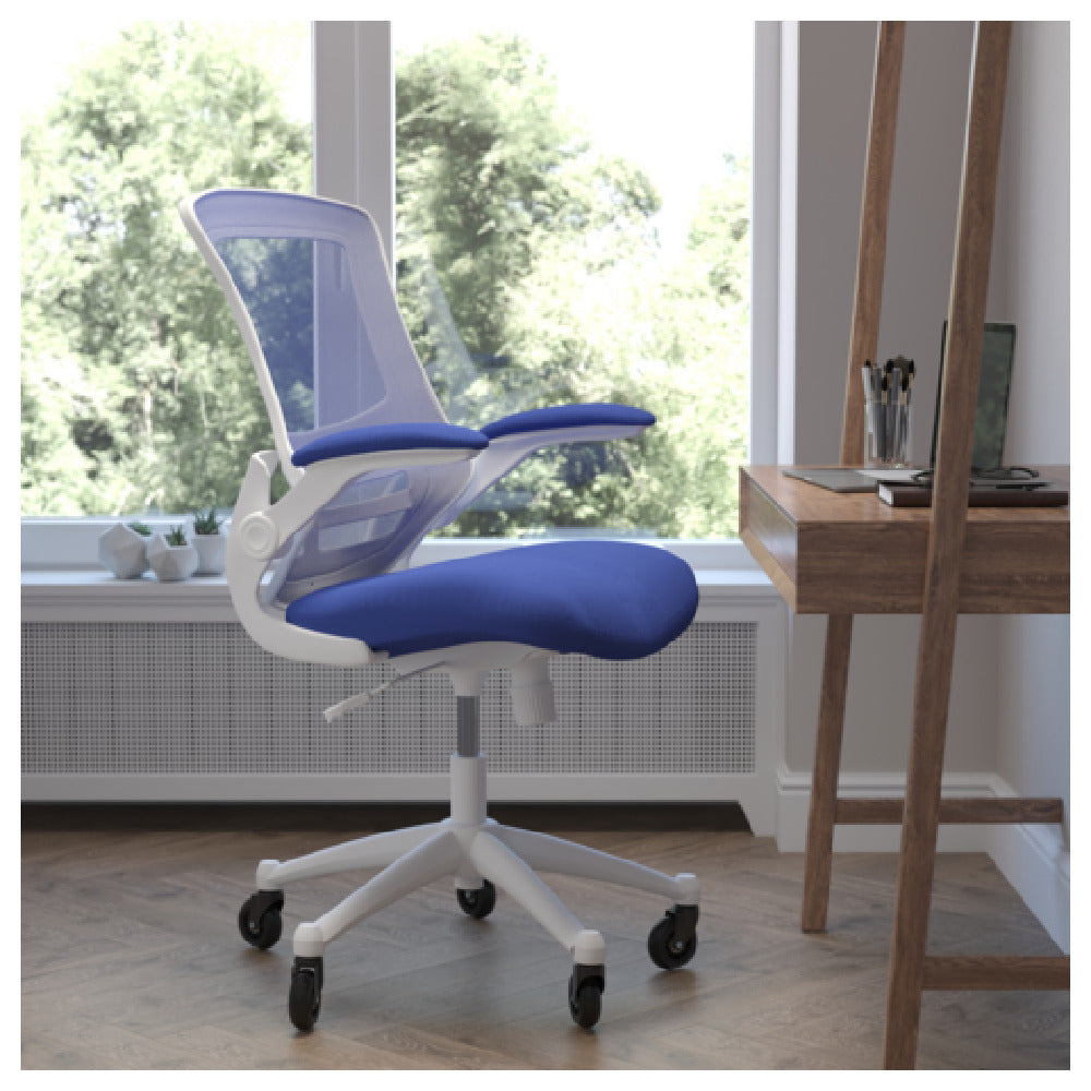 The Flash Furniture BL-X-5M-WH-BLUE-RLB-GG Kelista Swivel Task Chair is a versatile seating solution designed to accommodate a range of office environments with its adjustable height spanning from 37-1/2" to 41-1/4". With a weight capacity of 250 lbs, this chair is built for durability and comfort. Its mid-back design features a ventilated mesh back, promoting airflow for extended comfort, while a padded upholstered waterfall seat aids in reducing pressure on the thighs. The chair includes built-in lumbar support, crucial for maintaining good posture during long working hours. Adjustability is further enhanced with a tilt lock mechanism and a tilt tension adjustment knob, allowing users to customize their seating position effortlessly. Convenience meets functionality with padded flip-up arms, offering flexibility and additional support. The chair's heavy-duty white nylon base provides stability and durability, complemented by ball-bearing roller wheels for smooth mobility across surfaces. Finished in a vibrant blue, this chair requires assembly upon delivery. The Flash Furniture Kelista Swivel Task Chair is ideal for various market segments, from corporate offices to home workspaces, offering a blend of ergonomic features and modern design elements tailored to user comfort and productivity.
