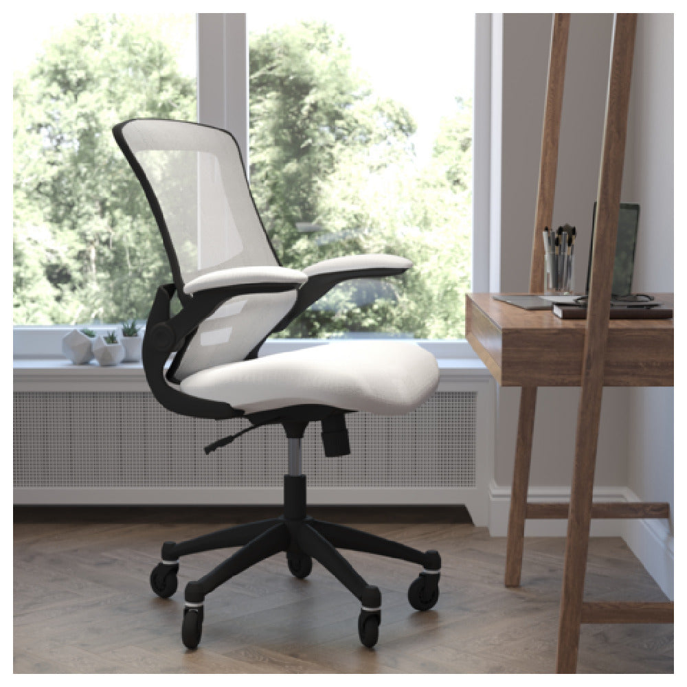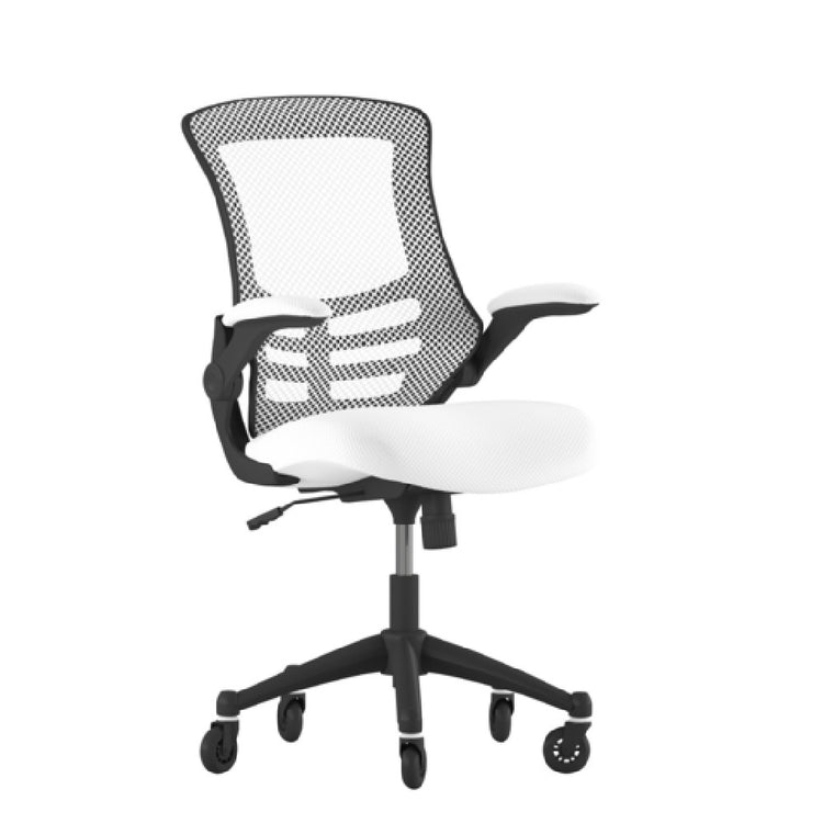 The Flash Furniture BL-X-5M-WH-RLB-GG Kelista Swivel Task Chair - 37-1/2" to 41-1/4" adjustable height - is designed for users across various professional environments seeking a blend of comfort and functionality. With a sturdy weight capacity of 250 lb, this chair caters to a wide range of users. The mid-back design promotes ergonomic support, further enhanced by a ventilated mesh back that ensures breathability during prolonged use. The padded upholstered waterfall seat adds to the comfort by reducing pressure on the legs, making it an excellent choice for those in office or home settings. Built-in lumbar support offers additional back comfort, while the tilt lock mechanism and tilt tension adjustment knob allow for customizable seating positions. Padded flip-up arms are a practical feature, allowing for increased flexibility and space-saving when not in use. The chair is supported by a heavy-duty black nylon base, equipped with ball-bearing roller wheels for smooth mobility. Available in a sleek white finish, it requires assembly upon delivery. This chair combines function and style, making it a valuable asset for businesses or home offices that prioritize both comfort and aesthetic appeal.