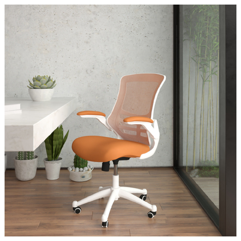 The Flash Furniture BL-X-5M-WH-TAN-GG Swivel Task Chair 37-1/2" To 41-1/4" Adjustable Height is a versatile seating solution designed to cater to various market segments, including office environments, home workspaces, and educational settings. This chair features a mid-back design that provides essential support, making it suitable for prolonged sitting periods. The ventilated mesh back ensures breathability, enhancing comfort by allowing airflow to the user's back. The chair is equipped with a padded upholstered waterfall seat, which reduces pressure on the thighs, promoting better circulation. Built-in lumbar support aids in maintaining proper posture, reducing the risk of back strain. The tilt lock mechanism and tilt tension adjustment knob provide users the ability to customize their seating angle and resistance, offering ergonomic flexibility. Padded flip-up arms allow for easy access and additional comfort, while the CA117 fire retardant foam guarantees safety standards. Supported by a heavy-duty white nylon base, the chair boasts a 250 lb. weight capacity, ensuring robust performance. Dual wheel casters facilitate smooth mobility across different floor types. This task chair requires assembly but typically ships within 24 hours for in-stock items, making it a practical choice for those seeking functional and reliable seating solutions.