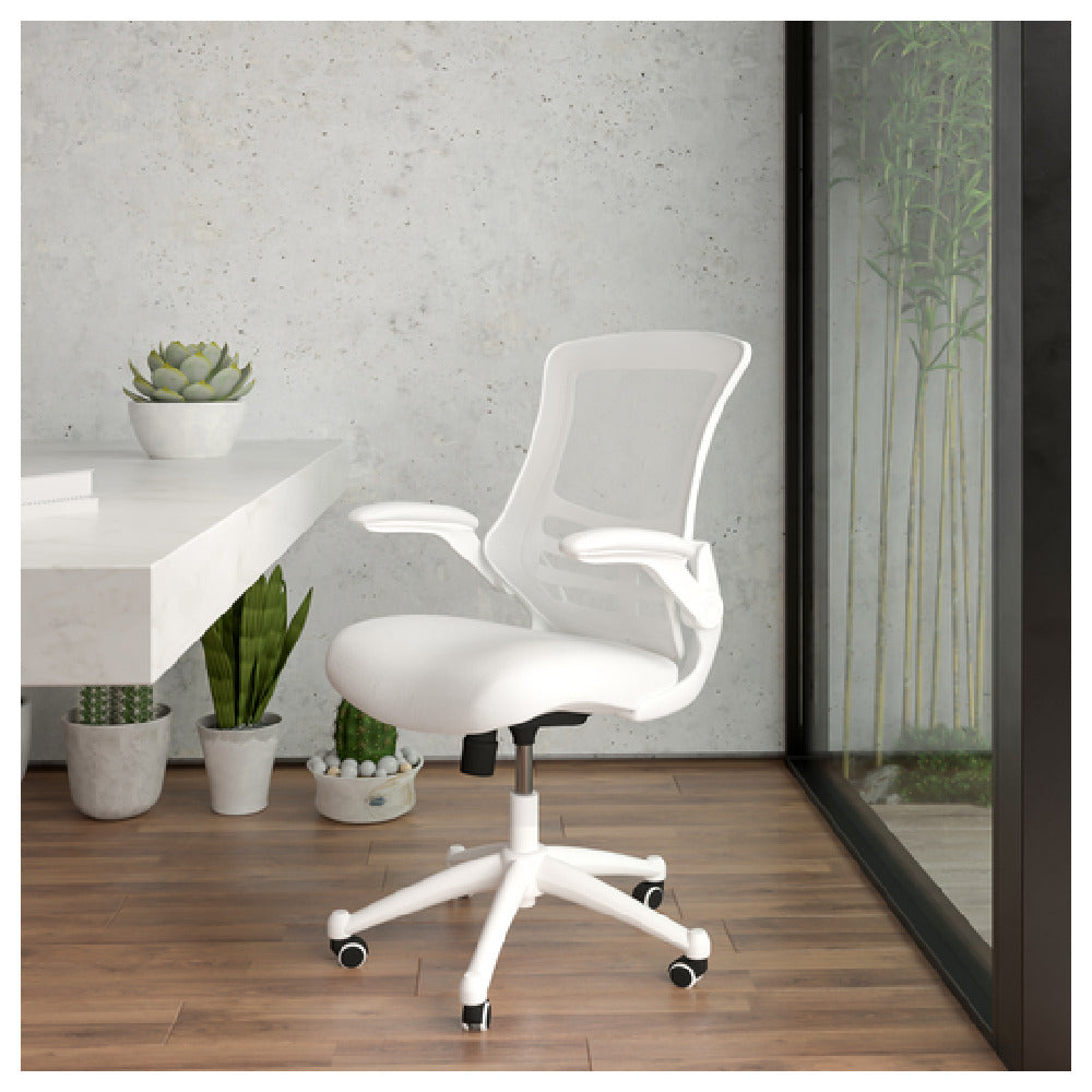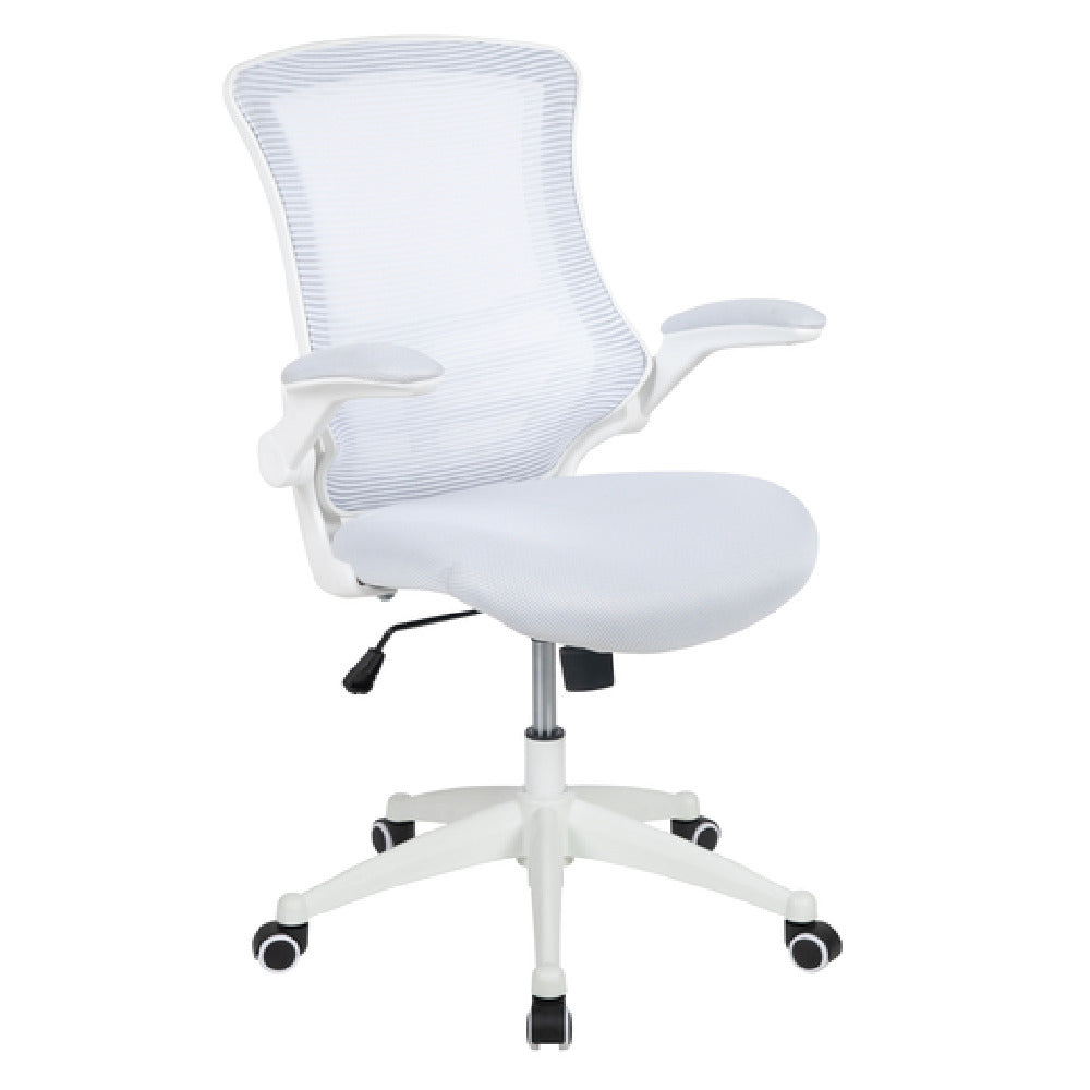 The Flash Furniture BL-X-5M-WH-WH-GG Swivel Task Chair 37-1/2" to 41-1/4" Adjustable Height is a versatile seating solution designed for various work environments. With a weight capacity of 250 lb, this chair is constructed to accommodate a wide range of users comfortably. Its mid-back design features a ventilated mesh back, which enhances airflow and provides a cool seating experience, making it suitable for long hours of use. The padded upholstered waterfall seat promotes better posture by reducing pressure on the legs. Built-in lumbar support is included to maintain proper alignment, reducing back strain. This chair is equipped with a tilt lock mechanism and tilt tension adjustment knob, allowing users to customize reclining resistance and lock positions as needed. Padded flip-up arms offer flexibility and support, catering to different workstyles. The chair is built with a heavy-duty white nylon base and dual wheel casters for smooth mobility. Additionally, it includes CA117 fire retardant foam, ensuring safety and compliance with fire safety standards. This product requires assembly and ships within 24 hours for in-stock items, making it a convenient choice for businesses seeking functional, ergonomic office seating.