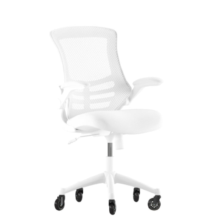 The Flash Furniture BL-X-5M-WH-WH-RLB-GG Kelista Swivel Task Chair 37-1/2" to 41-1/4" Adjustable Height is a versatile seating solution designed for various professional environments. With a weight capacity of 250 lbs, this chair combines durability with comfort, making it suitable for a wide range of users. The mid-back design provides essential support, and the ventilated mesh back enhances airflow, ensuring comfort during long hours of use. The padded upholstered waterfall seat promotes ergonomic seating posture, while the built-in lumbar support further supports back health. The chair features a tilt lock mechanism and a tilt tension adjustment knob, allowing for customizable reclining preferences. Padded flip-up arms add flexibility and comfort for users requiring arm support. The heavy-duty white nylon base ensures stability, supported by ball-bearing roller wheels for smooth mobility across different flooring surfaces. With its adjustable height range of 37-1/2" to 41-1/4", this chair caters to varied desk heights and user preferences, making it an adaptable choice for office settings. Assembly is required, and the chair's combination of functionality and modern aesthetics makes it a valuable addition to any workspace.