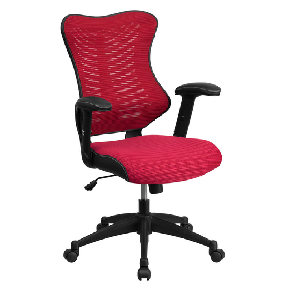 The Flash Furniture BL-ZP-806-BY-GG Designer Executive Swivel Office Chair is a versatile seating solution with adjustable height ranging from 39" to 42-3/4", catering to various professional settings. This chair supports a weight capacity of up to 250 pounds, making it a reliable choice for a wide range of users. It features a high back design combined with a ventilated mesh back to promote airflow, ensuring comfort during prolonged use. The padded mesh upholstered waterfall seat is designed to reduce leg strain, enhancing the ergonomic benefits of the chair. Built-in lumbar support further contributes to maintaining a healthy posture. The chair is equipped with a tilt lock mechanism and a tilt tension adjustment knob, allowing users to customize their seating experience. The white stitch accent on the seat and arms adds a touch of sophistication, while the height-adjustable padded arms enhance user comfort. Constructed with CA117 fire retardant foam, this chair prioritizes safety without compromising on quality. Supported by a heavy-duty black nylon base and dual wheel casters, it offers robust mobility and stability. The chair is available in burgundy and requires assembly upon delivery, with in-stock items typically shipping within 24 hours.
