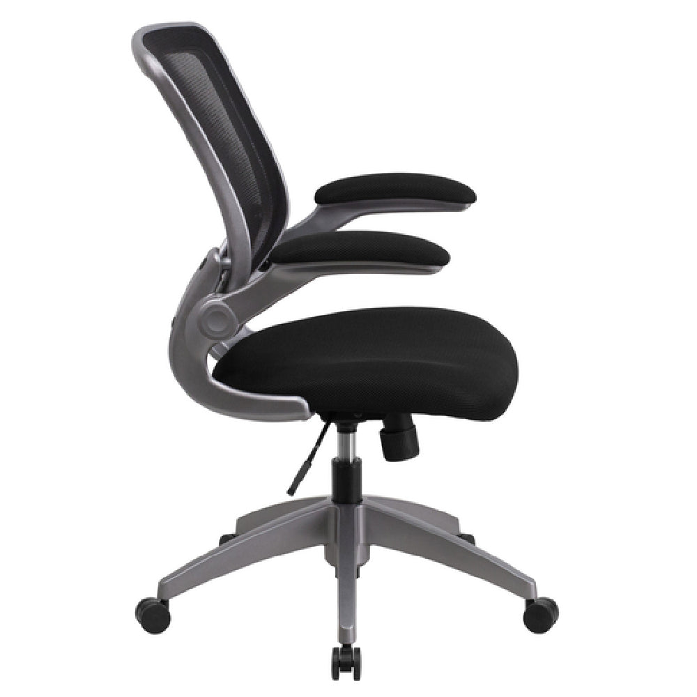 The Flash Furniture BL-ZP-8805-BK-GG Swivel Task Chair is a versatile seating solution designed for diverse professional environments. With an adjustable height ranging from 37-1/2 inches to 42-1/4 inches, this chair accommodates a variety of desk heights, enhancing ergonomic comfort. It boasts a mid-back design, providing essential support for daily use, while the mesh back ensures breathability during extended periods of sitting. The chair is equipped with a padded mesh upholstered waterfall seat, contributing to improved circulation and comfort. Built-in lumbar support offers crucial back support, reducing strain during long work sessions. The tilt lock mechanism and tilt tension adjustment knob allow users to customize their seating experience for optimal relaxation or focus. Padded flip-up arms add flexibility, enabling easy transition from a task chair to an armless chair when needed. Engineered with CA117 fire retardant foam, it prioritizes user safety. The heavy-duty gray nylon base, paired with dual wheel casters, ensures stability and smooth mobility across various surfaces. With a weight capacity of 250 lbs, it is a durable choice for a range of users. Designed for easy assembly, this chair is a practical addition to any office or home workspace, combining functionality with user-focused features.
