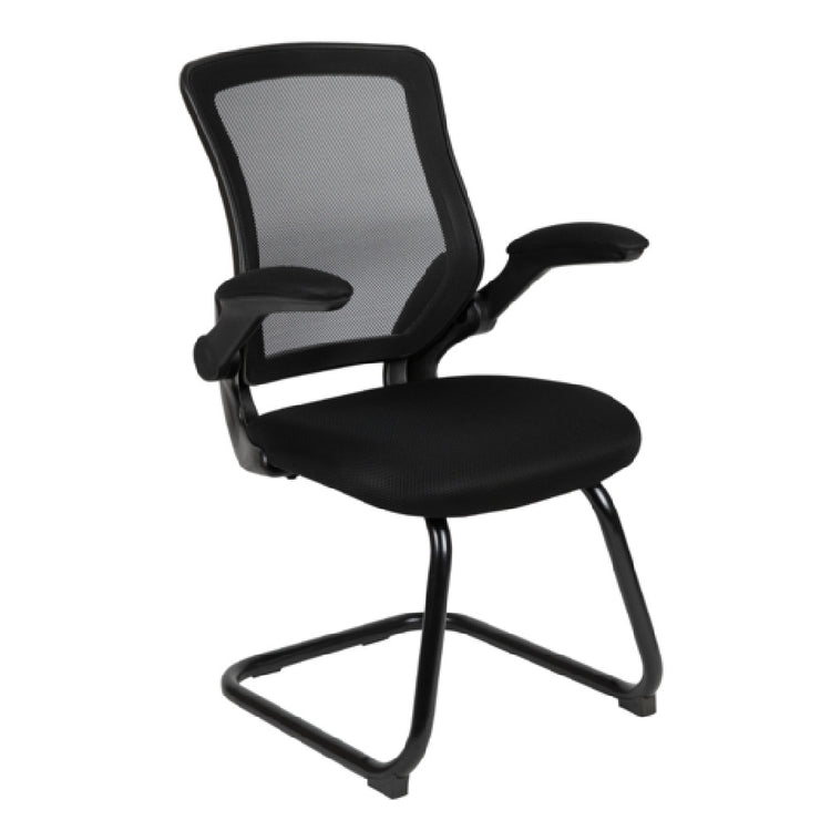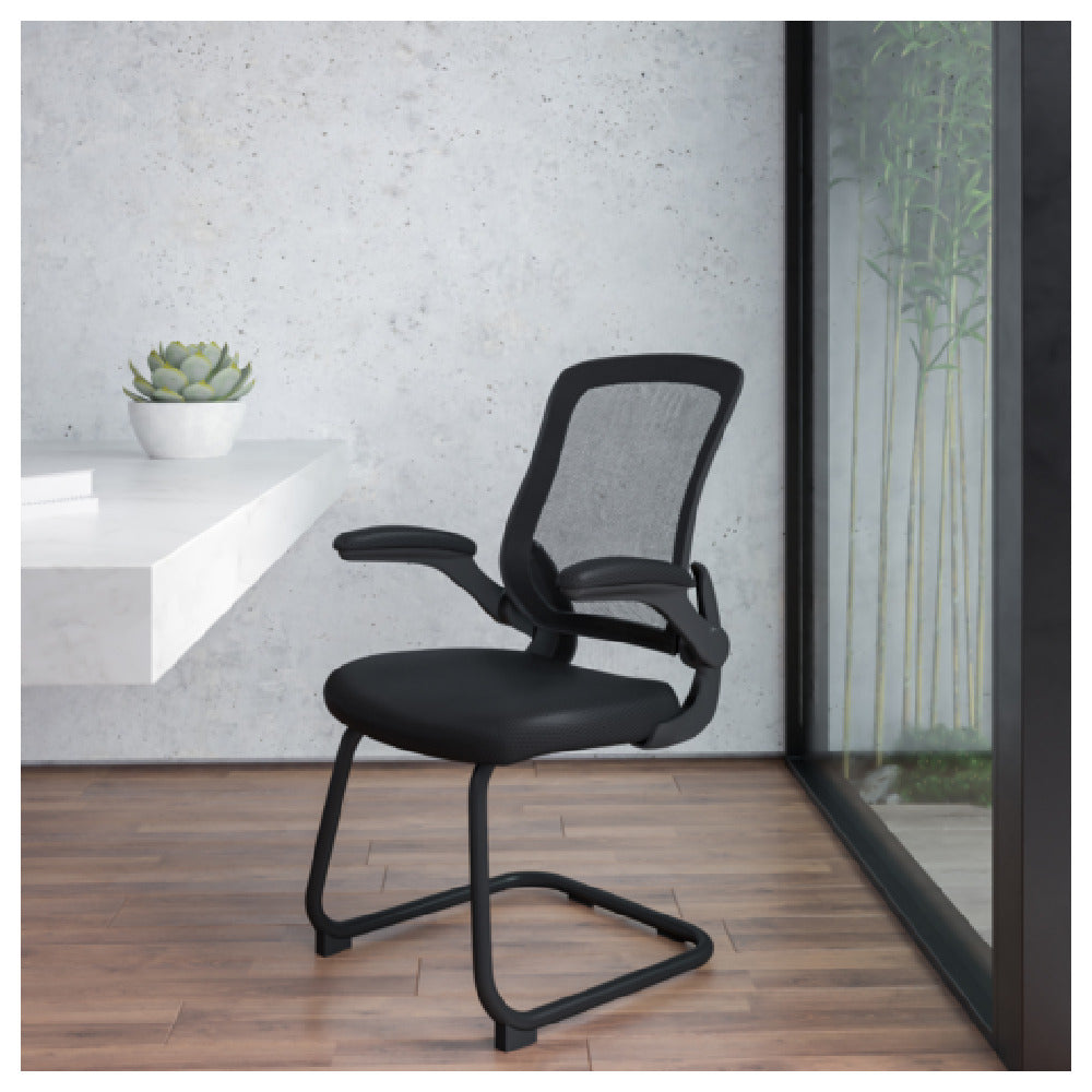 The Flash Furniture BL-ZP-8805C-GG Kale Armchair is a versatile seating solution designed for various professional environments, supporting a weight capacity of up to 250 lb. This chair features padded flip arms, offering customizable arm support for enhanced comfort. Its ventilated mesh back promotes airflow, making it ideal for users seeking breathability during extended periods of use, while the built-in lumbar support helps maintain proper posture. The padded mesh upholstered waterfall seat incorporates CAL 117 fire retardant foam, meeting fire safety standards and ensuring a comfortable seating experience. Engineered with a metal cantilever base, this armchair provides a stable seating foundation complemented by non-skid anti-tilt floor levers, which enhance stability and prevent unwanted movement on different floor types. The chair's sleek black finish offers a professional appearance suitable for modern office spaces or conference rooms. Assembly is required, allowing users to conveniently set up the chair according to their specific needs. The Flash Furniture BL-ZP-8805C-GG Kale Armchair combines ergonomic design with essential safety features, making it a valuable addition to office furniture products across diverse industry sectors.