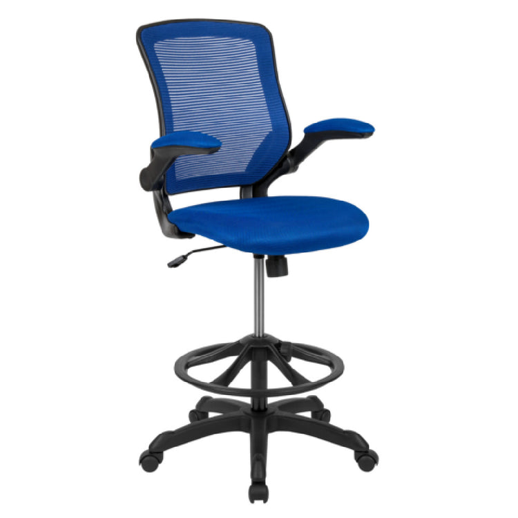 The Flash Furniture BL-ZP-8805D-BLUE-GG Kale Drafting Chair 42" to 49-1/2" Adjustable Height is a versatile seating solution designed for professionals across various industries. With its adjustable height range from 42" to 49-1/2", it caters to users who require flexibility and comfort at different workstation elevations. This chair supports a weight capacity of 250 lbs, ensuring robustness and durability. Its mid-back design coupled with a breathable mesh back and a padded mesh upholstered waterfall seat promotes ergonomic posture and comfort during extended periods of use. Enhanced with built-in lumbar support, it addresses the need for proper spinal alignment. The tilt lock mechanism and tilt tension adjustment knob allow users to customize their seating experience. Featuring padded flip-up arms, it offers easy access and space-saving benefits. The chair includes a height-adjustable nylon foot ring, providing additional support for users at elevated work surfaces. Constructed with a sturdy nylon base and equipped with dual-wheel casters, it ensures mobility and stability. The inclusion of CA117 fire retardant foam highlights its commitment to safety standards. Available in a vibrant blue color, this drafting chair is perfect for creative professionals, architects, and artists seeking a functional yet stylish seating option. (Assembly required.)