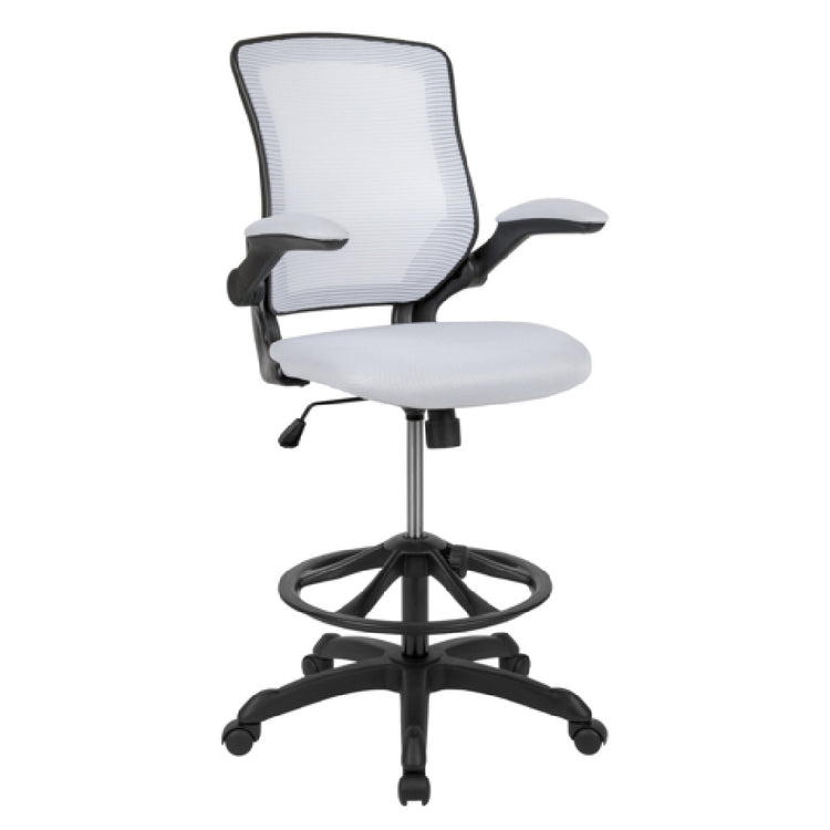 The Flash Furniture BL-ZP-8805D-WH-GG Kale Drafting Chair 42" To 49-1/2" Adjustable Height is designed to cater to the dynamic needs of professionals who require flexibility and comfort in their work environment. This chair features an adjustable height range of 42" to 49-1/2", accommodating various desk heights and user preferences, with a weight capacity of 250 lbs. The mid-back design incorporates a breathable mesh back for enhanced airflow, paired with a padded mesh upholstered waterfall seat to promote ergonomic seating and reduce pressure on the legs. Built-in lumbar support adds an extra layer of comfort, making it suitable for long hours of use. The chair is equipped with a tilt lock mechanism and tilt tension adjustment knob, allowing users to customize their recline angle and resistance. Padded flip-up arms provide additional versatility, enabling easy transitions between tasks. Safety is also considered with CA117 fire retardant foam. A height-adjustable nylon foot ring supports proper leg positioning, while the durable nylon base and dual wheel casters ensure smooth mobility and stability. Available in white and requiring assembly, this drafting chair is ideal for use in studios, workshops, and office environments where adaptability and comfort are paramount.