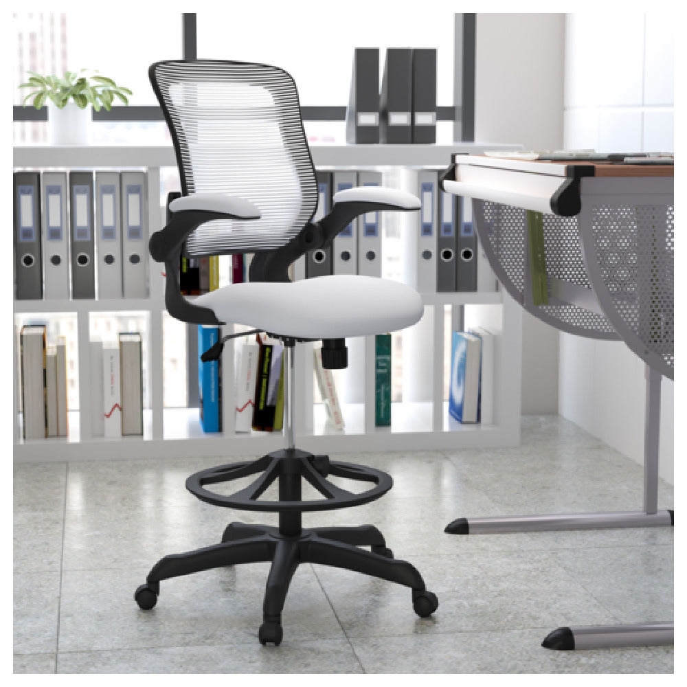 The Flash Furniture BL-ZP-8805D-WH-GG Kale Drafting Chair 42" To 49-1/2" Adjustable Height is designed to cater to the dynamic needs of professionals who require flexibility and comfort in their work environment. This chair features an adjustable height range of 42" to 49-1/2", accommodating various desk heights and user preferences, with a weight capacity of 250 lbs. The mid-back design incorporates a breathable mesh back for enhanced airflow, paired with a padded mesh upholstered waterfall seat to promote ergonomic seating and reduce pressure on the legs. Built-in lumbar support adds an extra layer of comfort, making it suitable for long hours of use. The chair is equipped with a tilt lock mechanism and tilt tension adjustment knob, allowing users to customize their recline angle and resistance. Padded flip-up arms provide additional versatility, enabling easy transitions between tasks. Safety is also considered with CA117 fire retardant foam. A height-adjustable nylon foot ring supports proper leg positioning, while the durable nylon base and dual wheel casters ensure smooth mobility and stability. Available in white and requiring assembly, this drafting chair is ideal for use in studios, workshops, and office environments where adaptability and comfort are paramount.