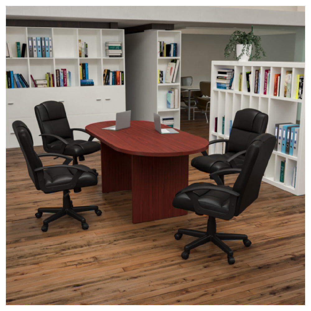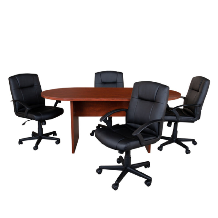 - Includes (4) mid-back black LeatherSoft chairs for comfort