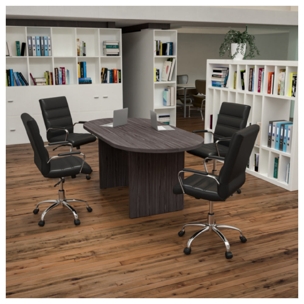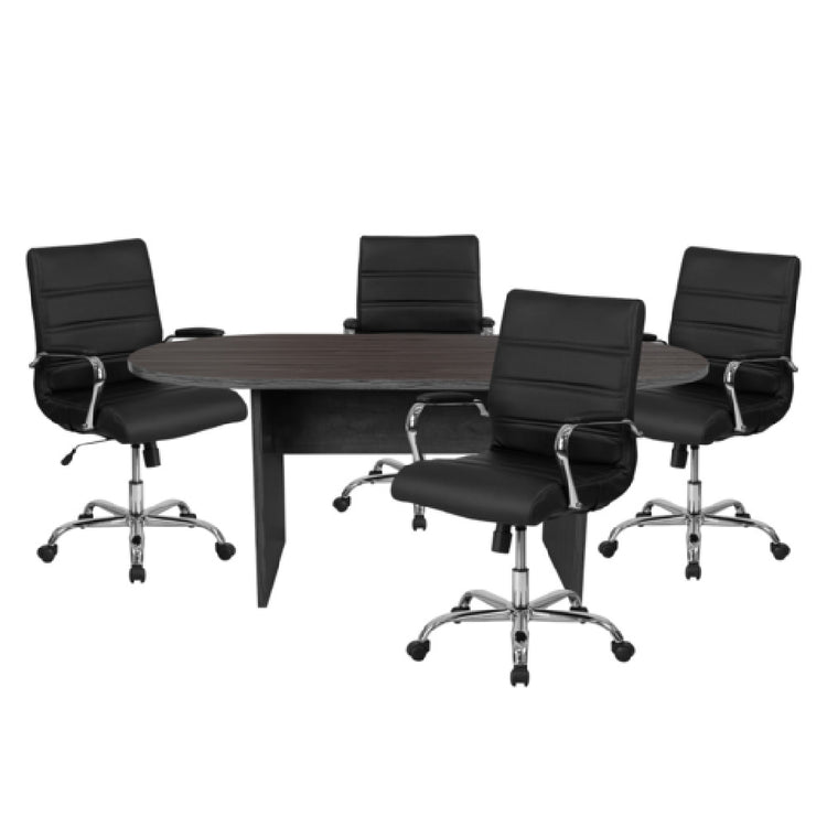 The Flash Furniture BLN-6GCGRY2286-BK-GG Lake Table and Chair Set is meticulously designed for versatility and comfort in both residential and commercial environments. This set features a 72-inch wide, 35-inch deep, and 29.5-inch high oval table, offering ample space for a variety of activities. The melamine laminate top, finished in a rustic gray, adds a sophisticated yet durable surface ideal for frequent use. Supported by panel legs, the table ensures stability and aesthetic appeal. Complementing this are four mid-back chairs crafted with black LeatherSoft material, combining leather and polyurethane for added softness and durability. Each chair supports up to 250 pounds and is enhanced with padded chrome arms for additional comfort. With built-in lumbar support, these chairs promote ergonomic seating, further optimized by a tilt lock mechanism and tilt tension adjustment knob for customizable recline and support. Dual wheel casters enhance mobility, making this set practical for dynamic spaces. This comprehensive furniture set is a valuable addition for various segment markets such as office settings, conference rooms, or stylish home dining areas. By merging functionality with elegant design, the Flash Furniture Lake Table and Chair Set stands as a unique proposition for diverse applications.