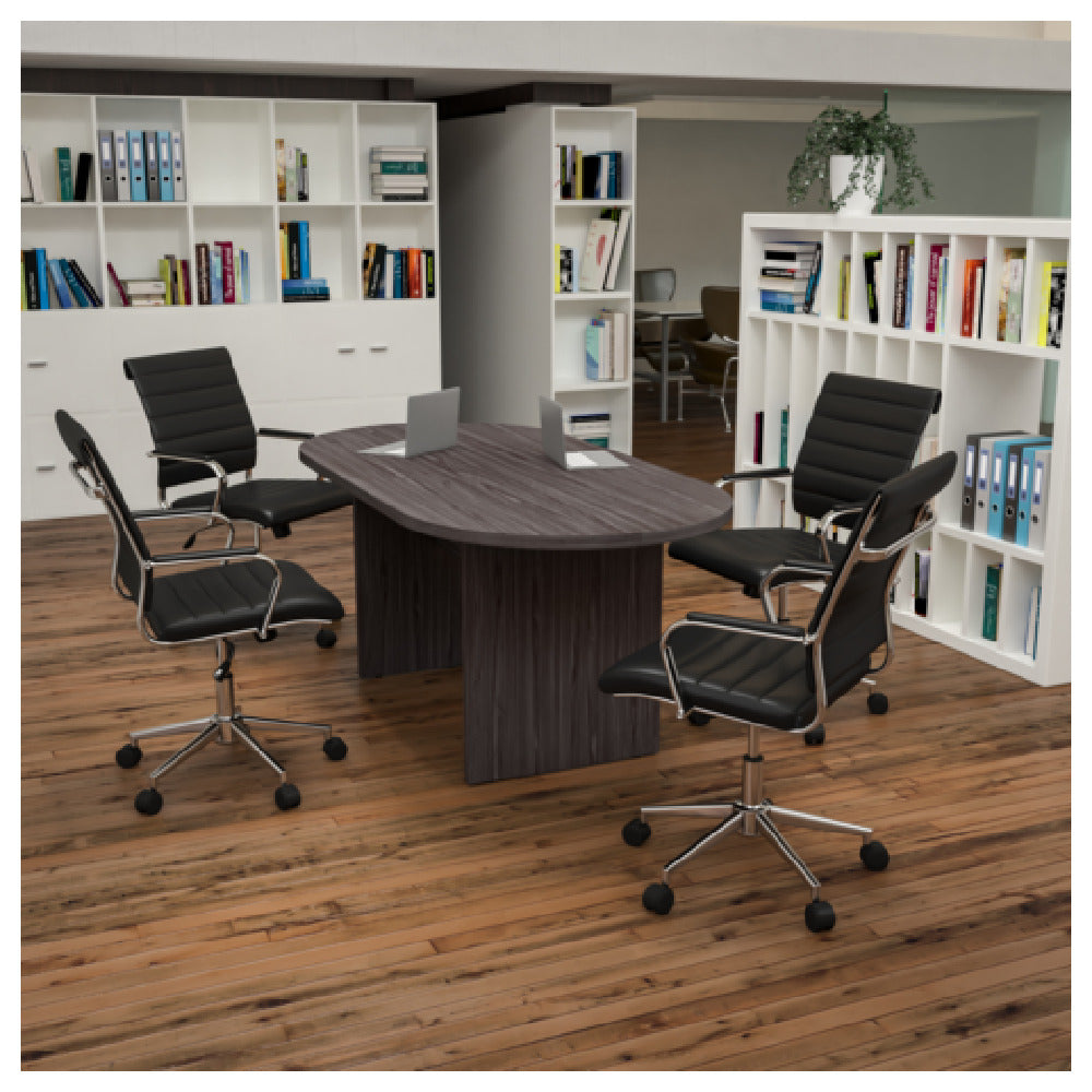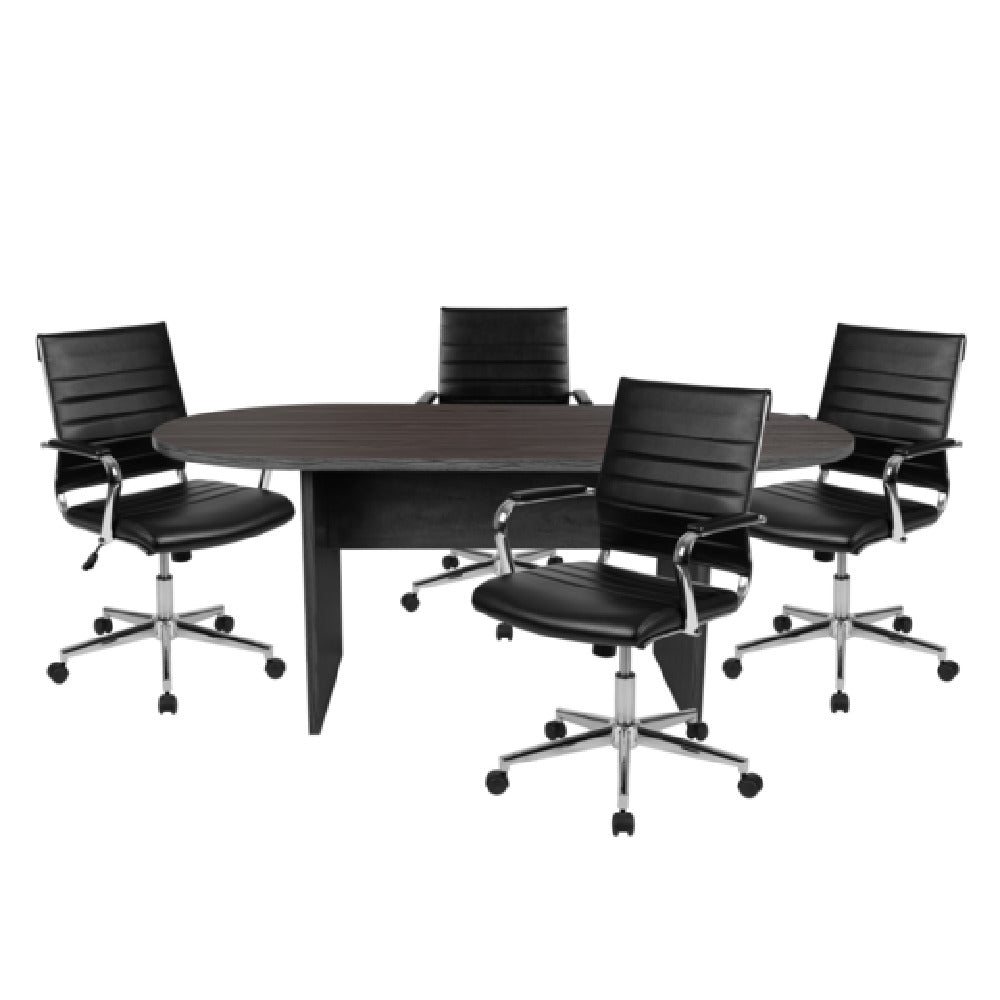The Flash Furniture BLN-6GCGRY595M-BK-GG Lake Table And Chair Set includes a 72"W x 35"D x 29-1/2"H oval table that is perfect for various settings, such as office conference rooms or sophisticated dining spaces. This table boasts a melamine laminate top in a rustic gray finish and features sturdy panel legs, ensuring durability and style. Complementing the table are four mid-back black LeatherSoft ribbed chairs, each designed with a 250 lb. weight capacity, making them suitable for different body types and uses. These chairs feature padded chrome arms for added comfort and built-in lumbar support to enhance ergonomic seating. Additionally, the chairs are equipped with a coat hanger bar, a tilt lock mechanism, and a tilt tension adjustment knob, providing customizable comfort and functionality. The dual wheel casters ensure easy mobility, making this set versatile for dynamic environments. This comprehensive set offers a blend of aesthetic appeal and practical features, catering to various market segments, including corporate offices and modern home settings, where style meets functionality.