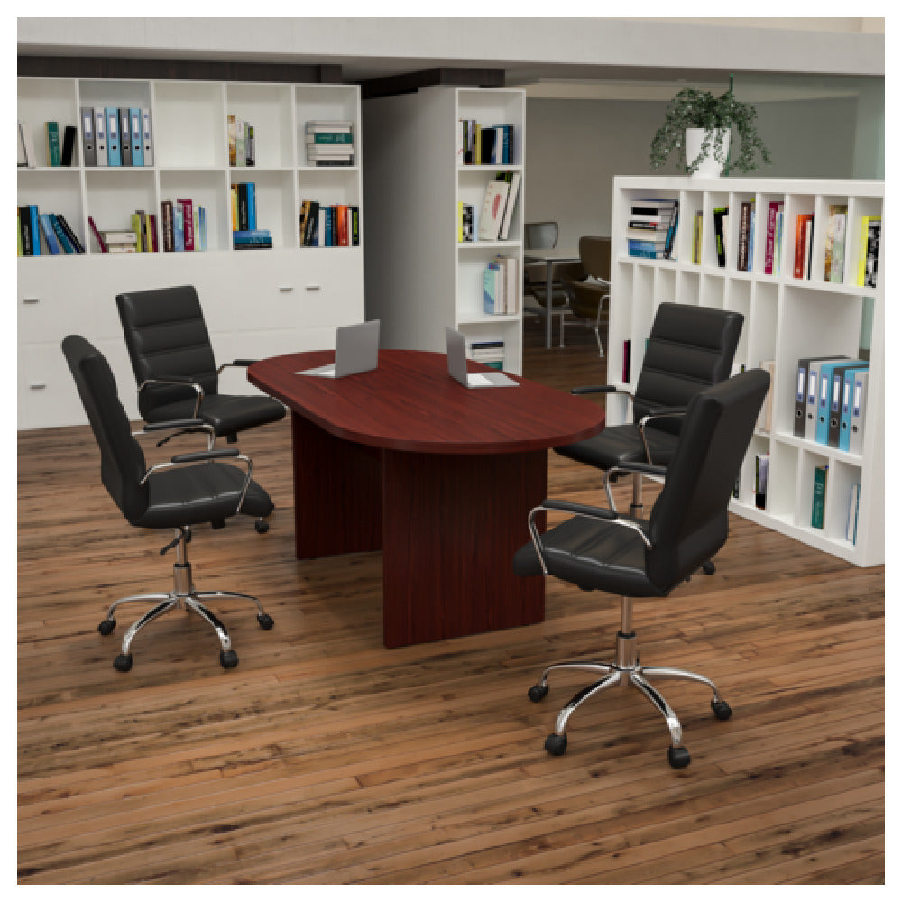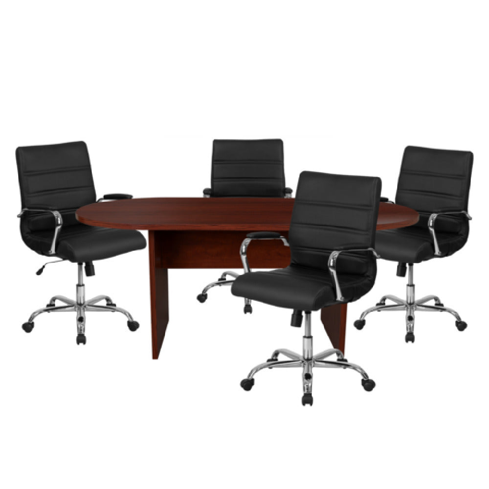 The Flash Furniture BLN-6GCMHG2286-BK-GG Lake Table and Chair Set includes a 72-inch wide by 35-inch deep by 29.5-inch high oval table, featuring a durable melamine laminate top with an elegant mahogany finish and sturdy panel legs. Accompanying the table are four mid-back black LeatherSoft chairs designed with a 250-pound weight capacity to accommodate various users comfortably. These chairs are equipped with padded chrome arms and built-in lumbar support, enhancing comfort during extended use. The tilt lock mechanism and tilt tension adjustment knob offer customizable seating positions, making them suitable for different preferences and ergonomic needs. Dual-wheel casters provide smooth mobility, facilitating easy movement across different floor surfaces. The Lake Table and Chair Set is ideal for diverse environments such as office meeting rooms, home dining areas, or collaborative workspaces, offering a blend of style, functionality, and comfort. This set effectively meets the demands of various market segments by combining classic design elements with modern features, making it a versatile choice for both professional and personal settings.