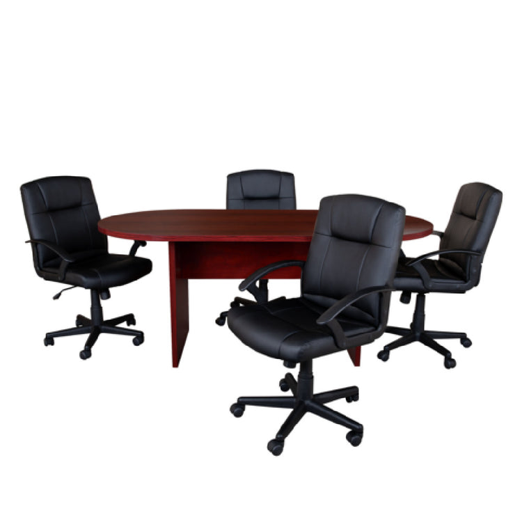 The Flash Furniture BLN-6GCMHGX000-BK-GG Lake Table and Chair Set is a versatile furniture solution designed to meet the needs of various market segments, from corporate conference rooms to home offices. This set features a 72-inch wide by 35-inch deep by 29-1/2-inch high oval table, crafted with a durable melamine laminate top and finished in an elegant mahogany that complements diverse interior styles. The table's panel legs provide robust support, ensuring stability during use. Accompanying the table are four mid-back black LeatherSoft chairs, each boasting a 250-pound weight capacity, making them suitable for a wide range of users. These chairs are designed with curved arms and built-in lumbar support to enhance ergonomic comfort. The tilt lock mechanism and tilt tension adjustment knob allow for personalized seating flexibility, catering to user preference and promoting prolonged comfort. Dual wheel casters enhance mobility, allowing the chairs to glide effortlessly across various floor surfaces. This comprehensive set, with its blend of aesthetic appeal and functional features, addresses the specific needs of professional spaces, providing both comfort and sophistication in any setting.