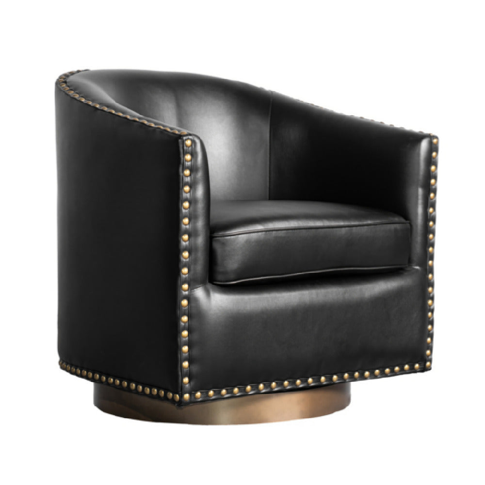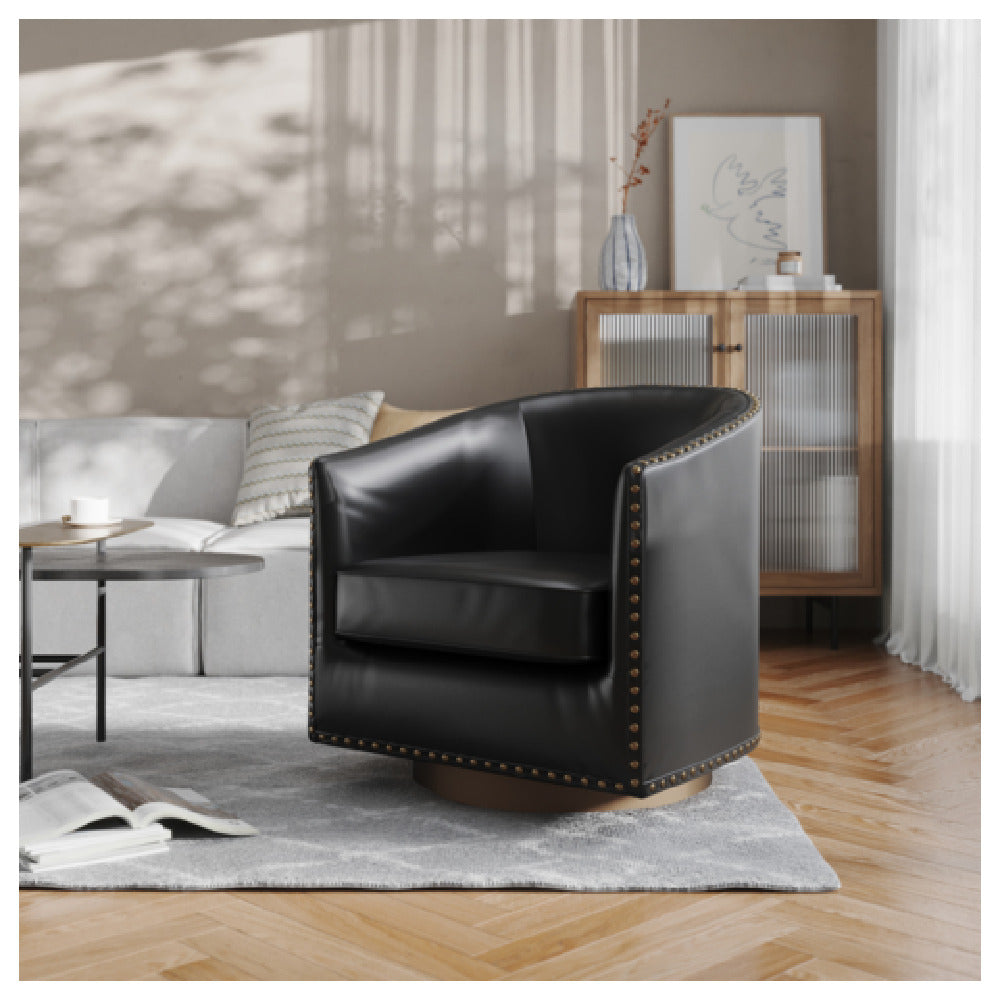 The Flash Furniture BS-AC22-061-BLKPU-GG Myles Club Style Commercial Barrel Accent Armchair is an expertly crafted seating solution that combines style and functionality for diverse commercial environments. This armchair features a unique 360-degree swivel mechanism, allowing for effortless rotation and versatility in use. Highlighted by its elegant brass decorative nail head trim, this chair exudes an upscale aesthetic appeal. Upholstered in LeatherSoft material, a blend of leather and polyurethane, it offers a supple and durable seating surface that is easy to maintain. The chair's barrel design adds to its sophisticated look, making it a perfect fit for modern office spaces, lounges, and hospitality settings. With its black color, it seamlessly integrates into various décor themes, enhancing the ambiance of any room. This armchair is designed to meet the demands of commercial usage, ensuring long-lasting performance and comfort. The thoughtfully curated design elements not only provide a striking visual but also contribute to the ergonomic support required in professional settings. Whether for corporate offices or upscale hotel lobbies, the Flash Furniture Myles Club Style Armchair delivers exceptional value by merging aesthetic elegance with robust functionality.