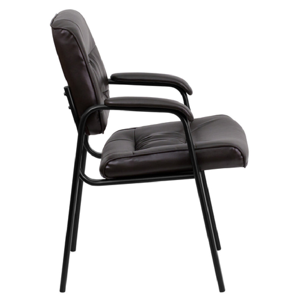 The Flash Furniture BT-1404-BN-GG Executive Side Reception Chair 250 Lb. Weight Capacity is a sophisticated seating option designed for a variety of professional environments, such as offices, waiting rooms, and reception areas. This chair combines style and functionality with its tufted back and tufted waterfall seat, offering both aesthetic appeal and comfort. The contoured cushions contribute to a supportive seating experience, while the padded arms add an extra layer of comfort for users. Upholstered in LeatherSoft, a blend of leather and polyurethane, this chair provides enhanced durability and a soft touch. The chair is constructed with a black metal frame, ensuring stability and longevity, and it includes floor glides to protect flooring surfaces. Rated with a 250 lb. weight capacity, it accommodates a wide range of users. The CA117 fire retardant foam meets safety standards, making it suitable for any business environment. Available in brown, this chair requires assembly and typically ships within 24 hours when in stock, ensuring convenience and quick availability for businesses needing to furnish or upgrade their space promptly.