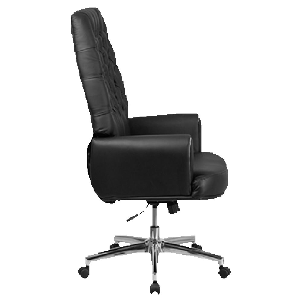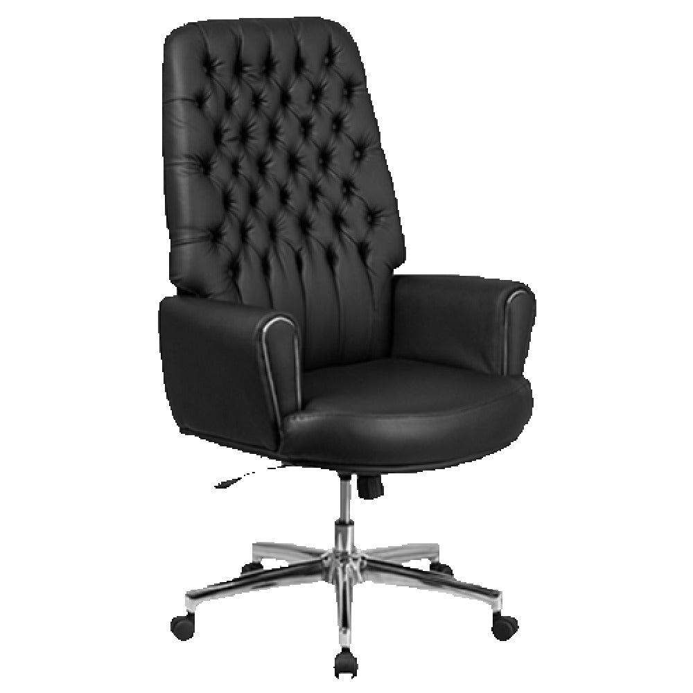 The Flash Furniture BT-444-BK-GG Traditional Executive Swivel Office Chair represents a synthesis of ergonomic design and classic aesthetic, tailored to enhance professional environments. This office chair offers a height adjustment range of 48 to 50-1/2 inches, accommodating various desk heights and user preferences. Engineered for comfort and durability, it supports a weight capacity of up to 250 pounds. The high-back design is enveloped in LeatherSoft upholstery, a blend of leather and polyurethane, providing a soft yet durable seating surface. Safety is paramount with CA117 fire retardant foam integrated within the chair. The button tufted back adds a touch of elegance, while the tilt lock mechanism and tilt tension adjustment knob allow for personalized recline settings. Fully upholstered padded arms with silver trim enhance comfort. A heavy-duty chrome base ensures stability, complemented by dual wheel casters for effortless mobility. Available in black, this chair requires assembly and typically ships within 24 hours. Its robust construction and sophisticated design make it an ideal choice for executives, managers, and anyone seeking a blend of style and function in a professional office setting.