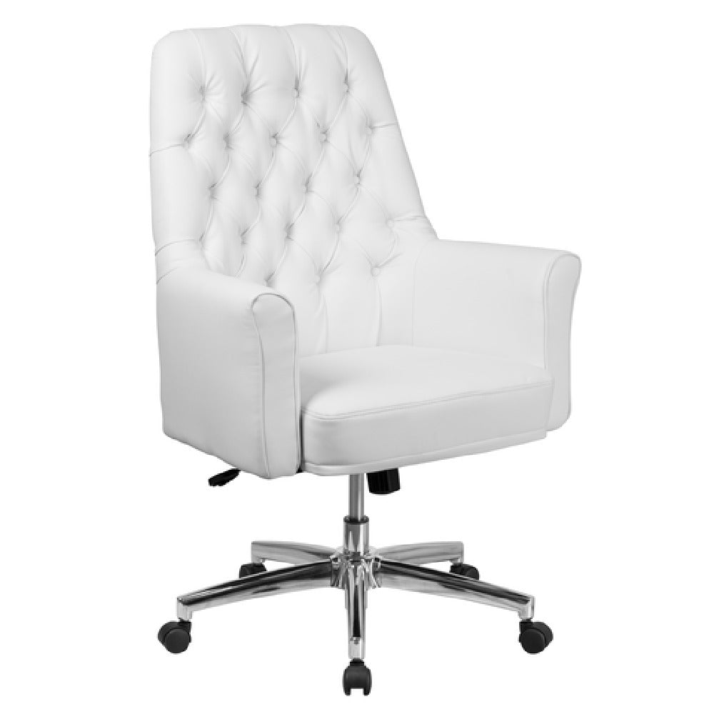 The Flash Furniture BT-444-MID-WH-GG Traditional Executive Swivel Office Chair exemplifies quality and comfort, catering to diverse professional environments. This chair features a mid-back design and is upholstered with LeatherSoft, a blend of leather and polyurethane, ensuring durability and a soft touch. Its adjustable height ranges from 42 to 45 inches, accommodating various desk heights and user preferences. With a 250 lb. weight capacity, it supports a wide range of users. The chair incorporates CA117 fire retardant foam, enhancing safety standards. The button tufted back adds a touch of classic elegance, while the tilt lock mechanism and tilt tension adjustment knob provide customizable seating positions for enhanced comfort. Fully upholstered padded arms offer additional support, making long hours at work more bearable. It boasts a heavy-duty chrome base, ensuring stability, and is equipped with dual wheel casters for effortless mobility across different floor types. Available in a sleek white finish, this chair requires assembly upon delivery. This model is particularly suited for executive offices, home workspaces, or meeting rooms, where style and functionality are paramount. Items in stock typically ship within 24 hours, ensuring a prompt addition to your office setup.