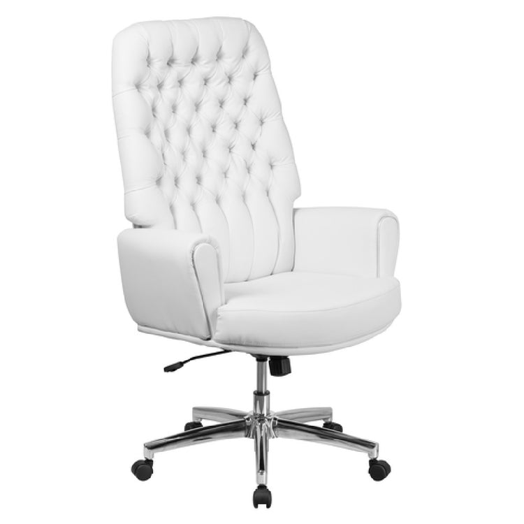 The Flash Furniture BT-444-WH-GG Executive Swivel Office Chair - 48" to 50-1/2" adjustable height - is designed with a high back and LeatherSoft upholstery, making it a sophisticated choice for professional environments. This chair supports up to 250 lbs, ensuring stability and durability for a wide range of users. Equipped with a tilt lock mechanism and tilt tension adjustment knob, it offers customizable comfort, catering to different seating preferences. The button tufted back adds a touch of elegance, while the fully upholstered padded arms with silver trim provide additional comfort and support. Its heavy-duty chrome base and dual wheel casters ensure mobility and sturdiness, making it suitable for various office setups. The chair's CA117 fire retardant foam adds an extra layer of safety, meeting stringent fire safety standards. Available in white, this chair requires assembly and is usually shipped within 24 hours when in stock. Its combination of style, ergonomic features, and robust construction makes it an excellent choice for executive offices, home offices, and other professional settings, offering both aesthetic appeal and practical functionality.
