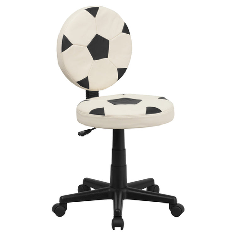 The Flash Furniture BT-6177-SOC-GG Soccer Task Chair is a dynamic seating solution designed with a unique black and white soccer ball pattern that appeals to sports enthusiasts and office environments alike. This chair features an adjustable height range of 32-3/4 inches to 37-1/4 inches, providing customizable comfort for users within its 150 lb. weight capacity. The round seat and back are upholstered in durable vinyl, ensuring both style and longevity. Engineered without arms, this chair allows for increased flexibility of movement, making it suitable for various settings, from children's rooms to casual office spaces. The CA117 fire retardant foam adds an extra layer of safety and compliance with fire safety standards. A robust black nylon base supports the chair, equipped with dual wheel casters that facilitate effortless mobility across different flooring types. Assembly is required, but items in stock typically ship within 24 hours, ensuring rapid delivery. The Flash Furniture BT-6177-SOC-GG Soccer Task Chair is a versatile piece that combines playful design with practical features, making it an excellent choice for diverse markets looking for a blend of aesthetics and functionality in a task chair.