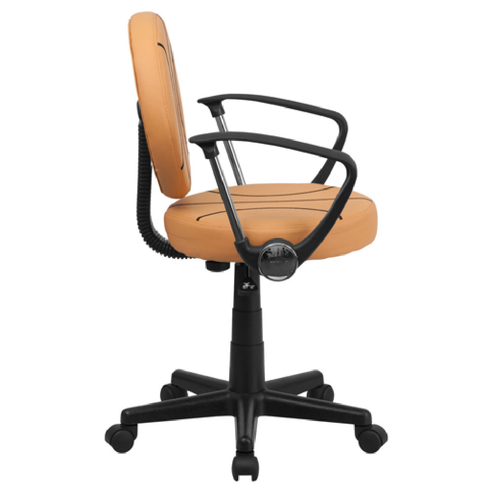 Flash Furniture BT-6178-BASKET-A-GG Basketball Task Chair 32-3/4" to 37-1/4" Adjustable Height is a unique seating solution tailored for sports enthusiasts and office users alike. This chair features a distinctive stitched orange and black basketball pattern, reflecting a sporty aesthetic while providing an ergonomic seating experience. The chair’s height is adjustable from 32-3/4 inches to 37-1/4 inches, accommodating various desk heights and user preferences. Supporting up to 150 lbs, the chair is built with a heavy-duty black nylon base, ensuring stability and durability. The round seat and back are upholstered in resilient vinyl, offering easy maintenance and enduring quality. Equipped with nylon arms, the chair provides additional comfort for prolonged use. Safety is enhanced with CA117 fire retardant foam, making it suitable for diverse environments. The dual-wheel casters facilitate smooth movement across different floor surfaces, increasing mobility and flexibility within any workspace. This product requires assembly, and items in stock typically ship within 24 hours, ensuring prompt delivery. Designed for both casual and professional settings, the Flash Furniture Basketball Task Chair merges functionality with a playful design, appealing to a wide range of users looking to bring a touch of sport-inspired flair to their environments.