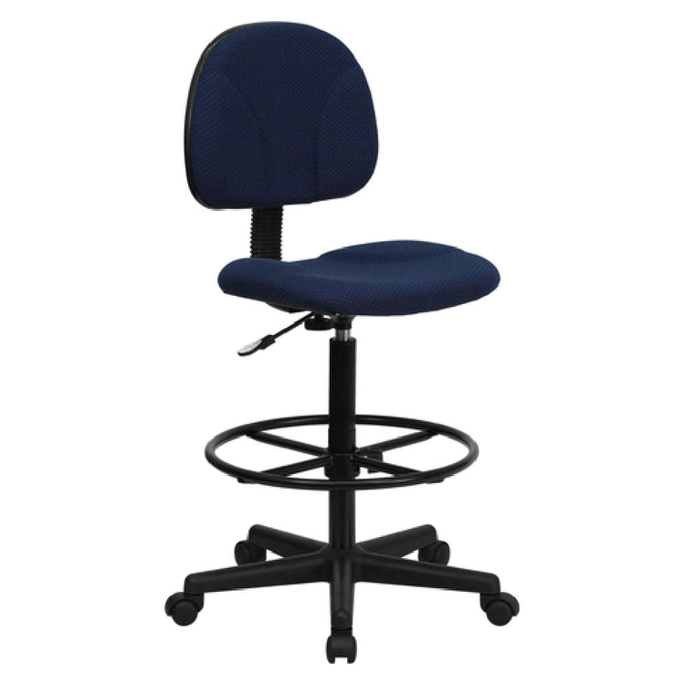 The Flash Furniture BT-659-NVY-GG Ergonomic Swivel Drafting Stool is a versatile seating solution, catering to various professional environments. This stool features an adjustable height range from 38-1/4" to 42-3/4", accommodating users of different statures. With a weight capacity of 250 lb., it ensures sturdy support, while its low back design and contoured seat and back promote ergonomic seating. The pin dot patterned polyester upholstery in navy blue adds a touch of elegance. A back depth adjustment knob and accordion back cover enhance user customization and comfort. Designed without arms, this stool is flexible and suitable for drafting tables or high desks. It boasts adjustable cylinder heights of 22-1/2" to 27" or 26" to 30-1/2", coupled with a height adjustable black foot ring, ensuring optimal leg support. The stool is constructed with CA117 fire retardant foam for added safety and a heavy-duty black nylon base with dual wheel casters for ease of mobility. This drafting stool requires assembly upon delivery, and in-stock items typically ship within 24 hours, making it a practical choice for fast-paced work environments. The Flash Furniture BT-659-NVY-GG is ideal for architects, artists, and other professionals seeking ergonomic and adaptable seating.