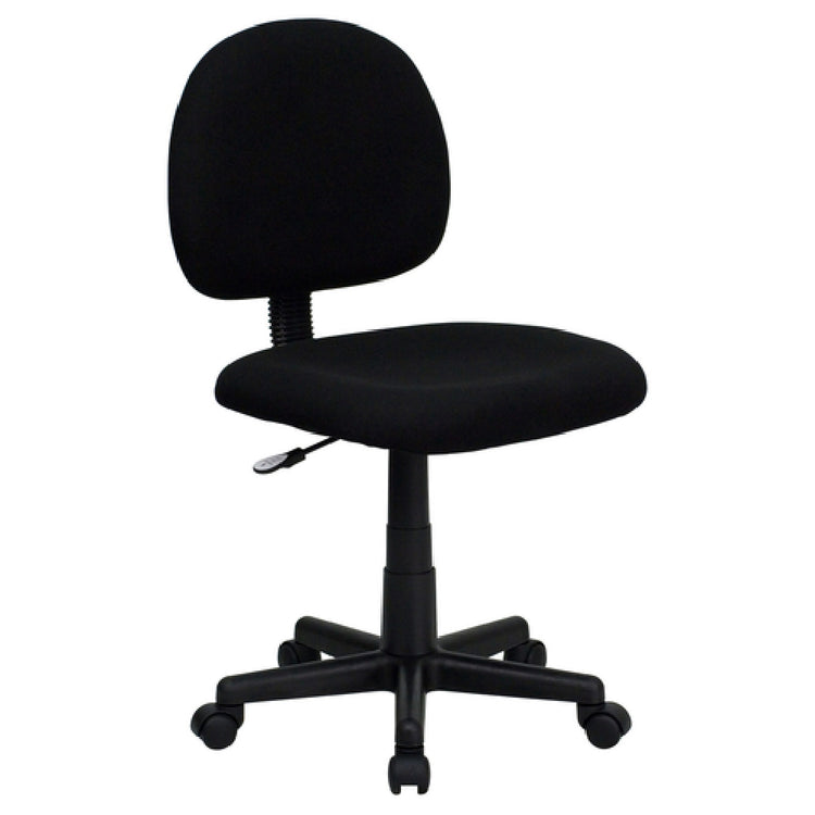 The Flash Furniture BT-660-BK-GG Ergonomic Swivel Task Chair is designed to meet the diverse needs of various industry segments through its thoughtful engineering and adaptable features. This chair offers a height adjustment range from 33 inches to 37-1/2 inches, accommodating users of different statures. With a weight capacity of 250 pounds, it suits a wide range of users in professional environments. The low back design, combined with a contoured seat and back, provides ergonomic support for prolonged comfort during work hours. Upholstered in durable fabric, this chair also features a back depth adjustment knob and an accordion back cover, ensuring a personalized fit and maintaining a sleek appearance. Notably, it is designed without arms, allowing it to fit seamlessly under desks of varying heights. The chair is constructed with CA117 fire retardant foam, enhancing safety in office settings. Its heavy-duty black nylon base and dual wheel carpet casters ensure stability and effortless mobility across different floor surfaces. Assembly is required, but the chair's straightforward design supports easy setup. The Flash Furniture BT-660-BK-GG stands out in its category, balancing practicality with comfort, making it a valuable addition to offices, home workspaces, and educational settings.