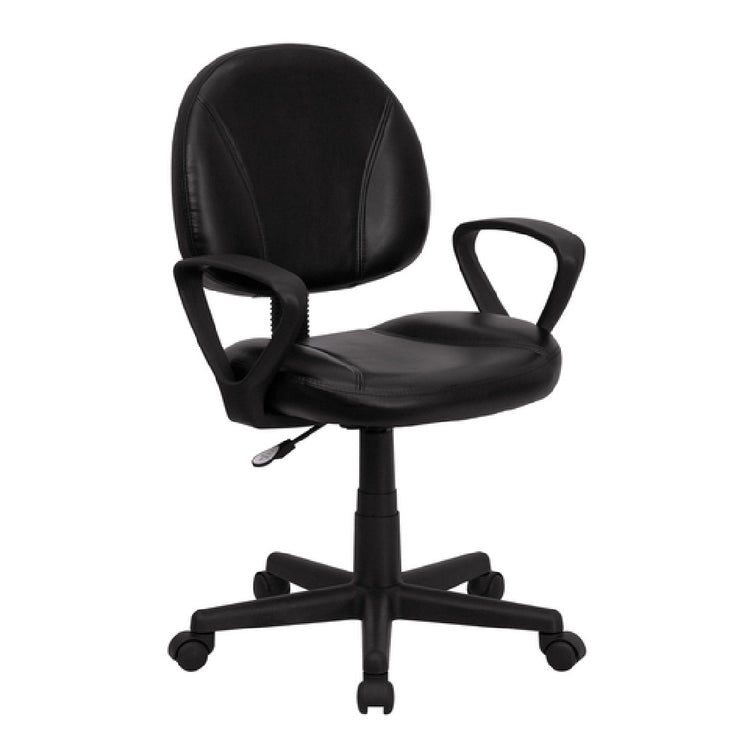 The Flash Furniture BT-688-BK-A-GG Ergonomic Swivel Task Chair is a versatile seating solution tailored for various professional environments, featuring an adjustable height range from 34" to 38-1/2" and supporting up to 250 lb. of weight capacity, making it suitable for a wide range of users. This chair's mid-back design, contoured seat, and back enhance comfort and support during extended use, while the LeatherSoft upholstery provides a premium feel with durability. Users can easily adjust the back depth using the convenient adjustment knob, ensuring personalized comfort. The accordion back cover adds a touch of style while concealing mechanism components. This chair is equipped with sturdy nylon arms and a heavy-duty black nylon base, ensuring stability and long-lasting performance. Dual wheel casters facilitate seamless mobility across various floor types. For safety, the chair incorporates CA117 fire retardant foam. Assembly is required, but the product is typically shipped within 24 hours for in-stock items. With its blend of ergonomic design and functional features, the Flash Furniture BT-688-BK-A-GG Ergonomic Swivel Task Chair is ideal for office workers, home users, and anyone seeking a reliable, adaptable office chair.