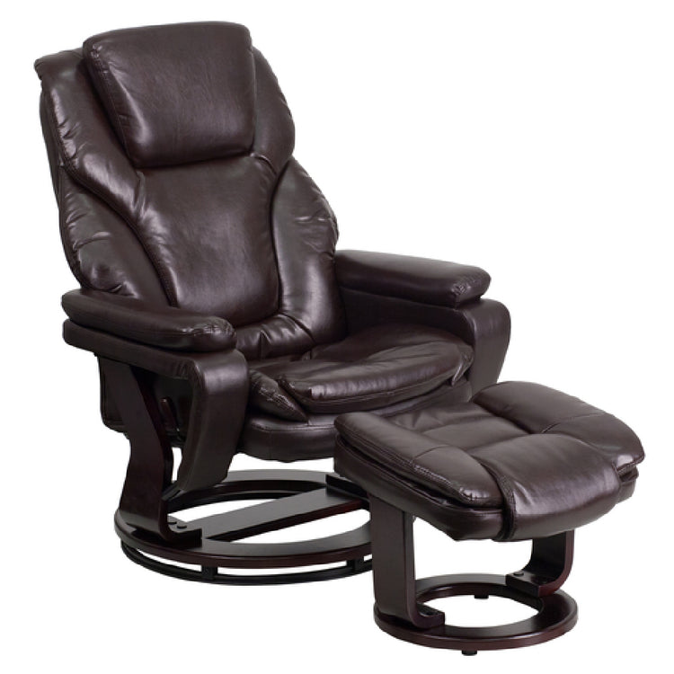 The Flash Furniture BT-70222-BRN-FLAIR-GG Swivel Recliner 31-1/2"W x 34 - 42"D 42"H is a contemporary style piece that combines comfort with functionality. It features a plush upholstered back and seat, partnered with an integrated headrest, which ensures maximum relaxation for users. The recliner is equipped with an adjusting lever for personalized comfort and includes plush upholstered arms for added support. A notable feature is its ball-bearing swiveling mechanism, which offers smooth rotation, along with a mahogany finished wood base that adds a touch of elegance. Enhanced with CA117 fire retardant foam, safety is prioritized without compromising on comfort. The recliner comes with a 20"W x 18-1/2"D x 15"H ottoman, providing additional leg support. Both pieces are crafted with brown LeatherSoft, known for its durability and soft feel. The product is designed with floor glides to protect your flooring. Assembly is required, and the item is often in stock, typically shipping within 24 hours. This recliner is particularly suitable for various markets, including home living spaces, office settings, and hospitality venues, where both style and comfort are paramount.