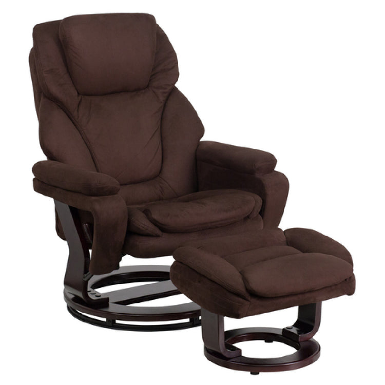 The Flash Furniture BT-70222-MIC-FLAIR-GG Swivel Recliner is a contemporary style seating solution that measures 31-1/2"W x 34 - 42"D x 42"H, designed for those who appreciate both comfort and functionality in their living spaces. It features a plush, upholstered back and seat with integrated headrest, ensuring a comfortable seating experience. The recliner is equipped with upholstered plush arms and CA117 fire retardant foam, prioritizing safety and relaxation. An adjusting lever allows for easy reclining adjustments, while a ball-bearing swivel mechanism ensures smooth rotation. The recliner's mahogany finished wood base adds a touch of elegance, complemented by floor glides that protect flooring surfaces. Included with this swivel recliner is a 20"W x 18-1/2"D x 15"H ottoman, perfect for added comfort. Upholstered in brown microfiber, the recliner and ottoman set requires assembly upon delivery. Notably, in-stock items typically ship within 24 hours, making it a reliable choice for residential and commercial environments alike. This recliner caters to diverse market segments, offering a sophisticated seating option for homes, offices, or relaxation spaces, where style, comfort, and quick availability are highly valued.