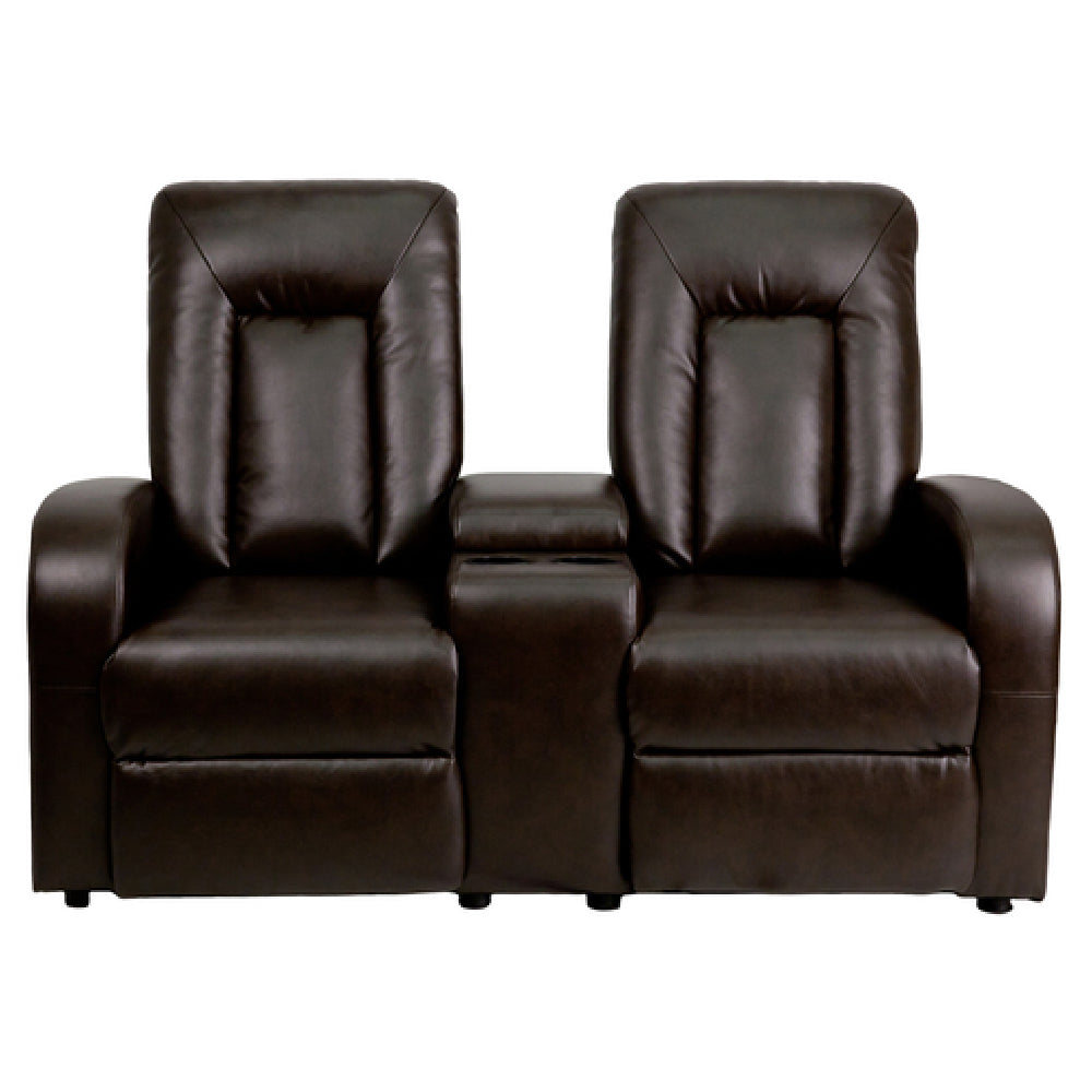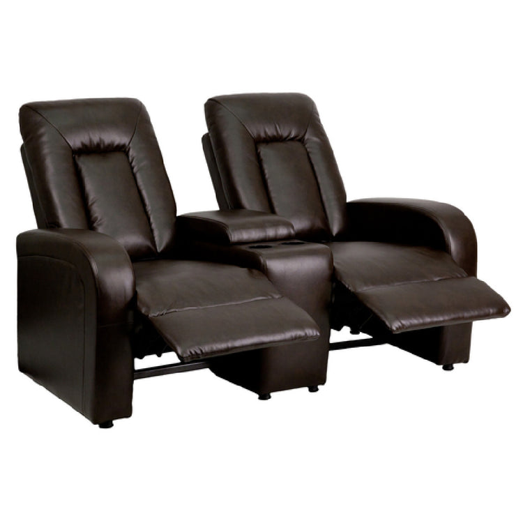 Flash Furniture BT-70259-2-BRN-GG Eclipse Series Theater Seating Unit is a versatile seating solution designed to enhance comfort and style in any entertainment setting. With dimensions of 63 inches in width, and a depth ranging from 38 inches to 68 inches, and a height of 43-1/2 inches, this contemporary seating unit is built to accommodate diverse space requirements. The unit features two reclining seats with soft plush back cushions, promoting relaxation during extended viewing sessions. A central storage console, equipped with two cup holders, adds functionality, making it ideal for home theaters, media rooms, and entertainment spaces. Constructed with CA117 fire retardant foam, it ensures safety without compromising on comfort. The brown LeatherSoft upholstery, a blend of leather and polyurethane, offers a luxurious feel while ensuring durability. Push-back functionality allows for easy reclining, while plastic floor glides protect flooring surfaces, making it suitable for various environments. This seating unit requires assembly and is available for quick shipping, usually within 24 hours for in-stock items, catering to the needs of customers seeking immediate upgrades to their entertainment spaces. The Eclipse Series Theater Seating Unit is a perfect blend of style, safety, and functionality, appealing to both residential and commercial markets.