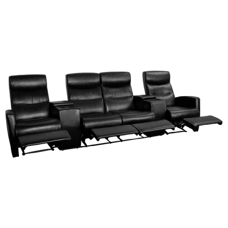 The Flash Furniture BT-70273-4-BK-GG Anetos Series Theater Seating Unit stands as a prime example of contemporary style meeting functional design. Measuring 120"W x 36" - 68-1/2"D x 40-1/4"H, this 4-seat reclining unit is crafted with black LeatherSoft, offering both durability and comfort. It integrates headrests for added support and features soft plush back cushions that enhance the seating experience. This unit is equipped with recessed levers for smooth reclining action and floor glides to ensure stability and ease of movement. In the realm of add-ons, it boasts (2) storage consoles, each fitted with 2-cup holders, catering to the convenience of theater-goers. Ensuring safety, it employs CA117 Fire Retardant Foam, meeting stringent fire safety standards. Assembly is required, and it ships in 3 boxes, usually dispatched within 24 hours for in-stock items. This theater seating unit is tailored for varied market segments, from home theater enthusiasts seeking plush comfort to commercial spaces desiring a reliable, stylish seating solution that enhances the cinematic experience.