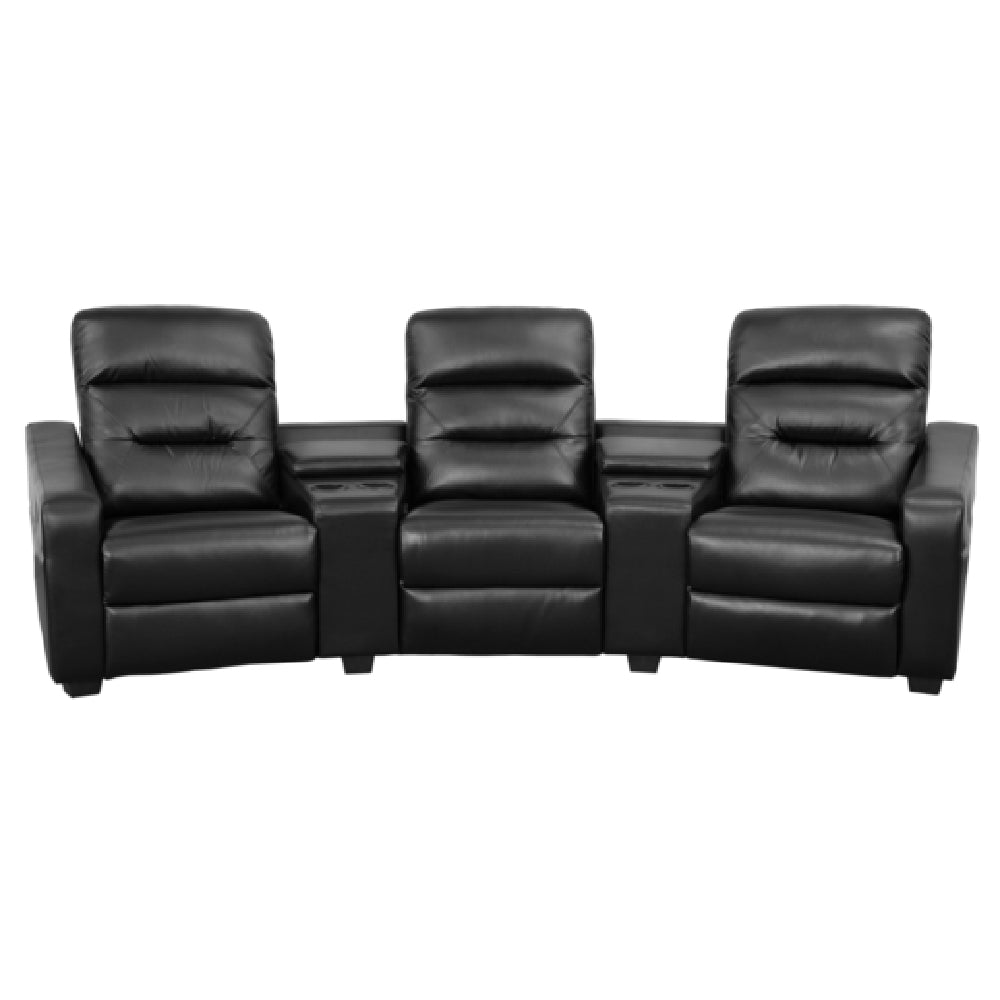 Flash Furniture BT-70380-3-BK-GG Futura Series Theater Seating Unit is engineered with precision to enhance entertainment experiences. This 3-seat unit reclines gracefully, offering comfort with plush pillow back cushions and slanted arms. Measuring 120"W x 45"-64"D x 40"H, it is an ideal fit for diverse spaces. The unit includes (2) storage consoles featuring 2-cup holders, optimizing convenience with functionality. The seating design incorporates (2) recessed levers and (1) pull handle, ensuring effortless operation. Raised black feet add a touch of elegance while maintaining stability. The seating unit is constructed with black LeatherSoft, combining durability and luxury. Safety is paramount, as evidenced by its CA117 fire retardant foam. The assembly is required and the product is shipped in 5 boxes, with in-stock items typically dispatched within 24 hours. This theater seating unit is versatile, catering to both residential and commercial markets, particularly home theaters and entertainment venues, seamlessly blending into various interior styles while offering a luxurious seating experience. It provides a sophisticated seating solution that meets the demands of comfort, style, and safety in a high-quality furniture piece.