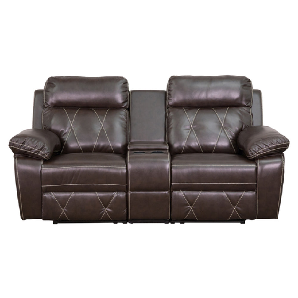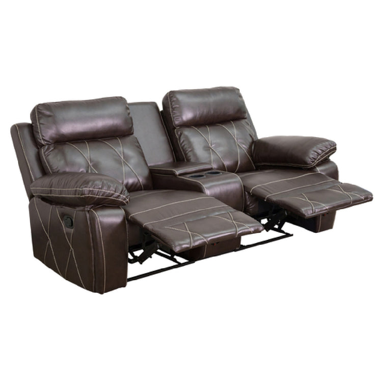 The Flash Furniture BT-70530-2-BRN-GG Reel Comfort Series Theater Seating Unit is designed for those who value both style and functionality in their home theater setup. With dimensions of 78"W x 37"-66"D x 40"H, this contemporary-style seating unit provides ample space for two individuals to enjoy a comfortable viewing experience. The unit features a reclining mechanism with integrated headrests, allowing users to find their perfect relaxation position. Plush arms add to the comfort, while a straight arm storage console with 2-cup holders ensures convenience. The contrast white stitching adds a touch of elegance to the brown LeatherSoft upholstery, which combines the look of leather with the durability and softness of fabric. Recessed levers make reclining seamless, and the plastic floor glides protect your flooring from scratches. Safety is prioritized with CA117 fire retardant foam, and assembly is required upon delivery. This product is shipped in 3 boxes, and in-stock items typically ship within 24 hours, ensuring a quick setup for your entertainment space. Ideal for home theaters, media rooms, or any space where comfort and style are paramount, this seating unit is a practical and attractive solution for enhancing your viewing experience.
