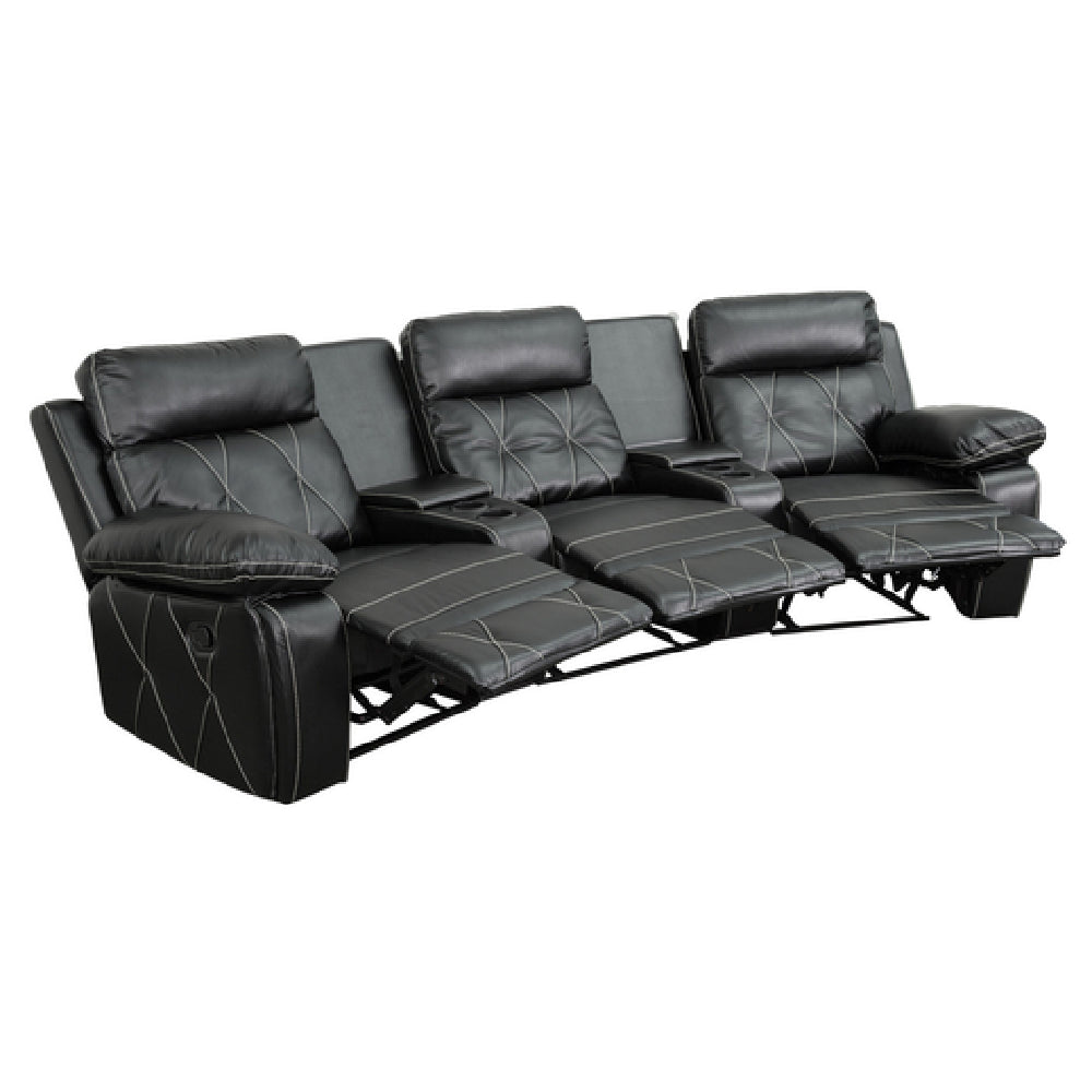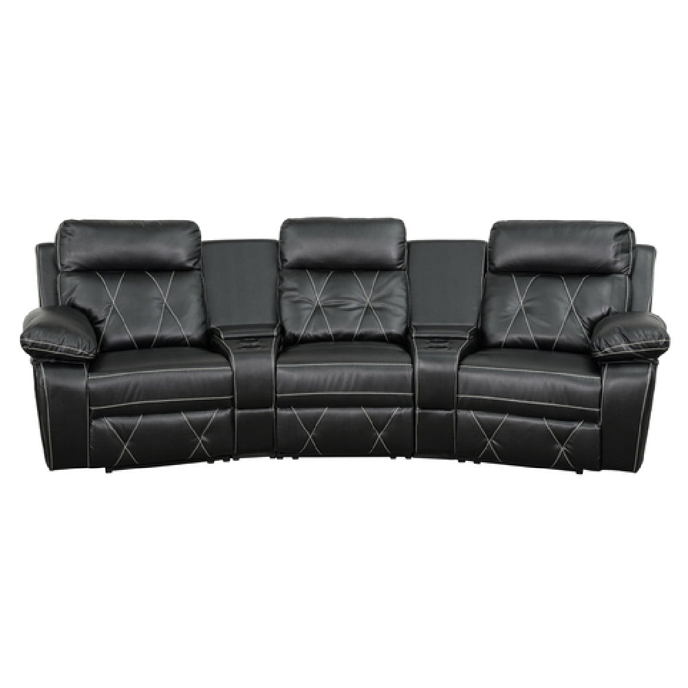 The Flash Furniture BT-70530-3-BK-CV-GG Reel Comfort Series Theater Seating Unit is a contemporary 3-seat recliner designed to enhance home theater experiences. Measuring 113 inches in width, 37 to 66 inches in depth, and 40 inches in height, it provides ample space and comfort for users. Each seat in this luxurious unit features an integrated headrest and plush arms, ensuring optimal relaxation. The seating unit comes with a wedge arm storage console, offering convenient storage solutions and two cup holders to keep refreshments within reach. Equipped with two recessed levers and one pull handle, the seating unit allows easy reclining adjustments. Its aesthetic appeal is enhanced by contrast white stitching against the black LeatherSoft upholstery, combining durability with a sophisticated look. The unit is supported by plastic floor glides for smooth movement and includes CA117 fire retardant foam for safety. Shipped in five boxes, assembly is required, and in-stock items typically ship within 24 hours. This meticulously crafted theater seating unit is ideal for both residential and commercial settings, providing a perfect blend of style, comfort, and functionality.