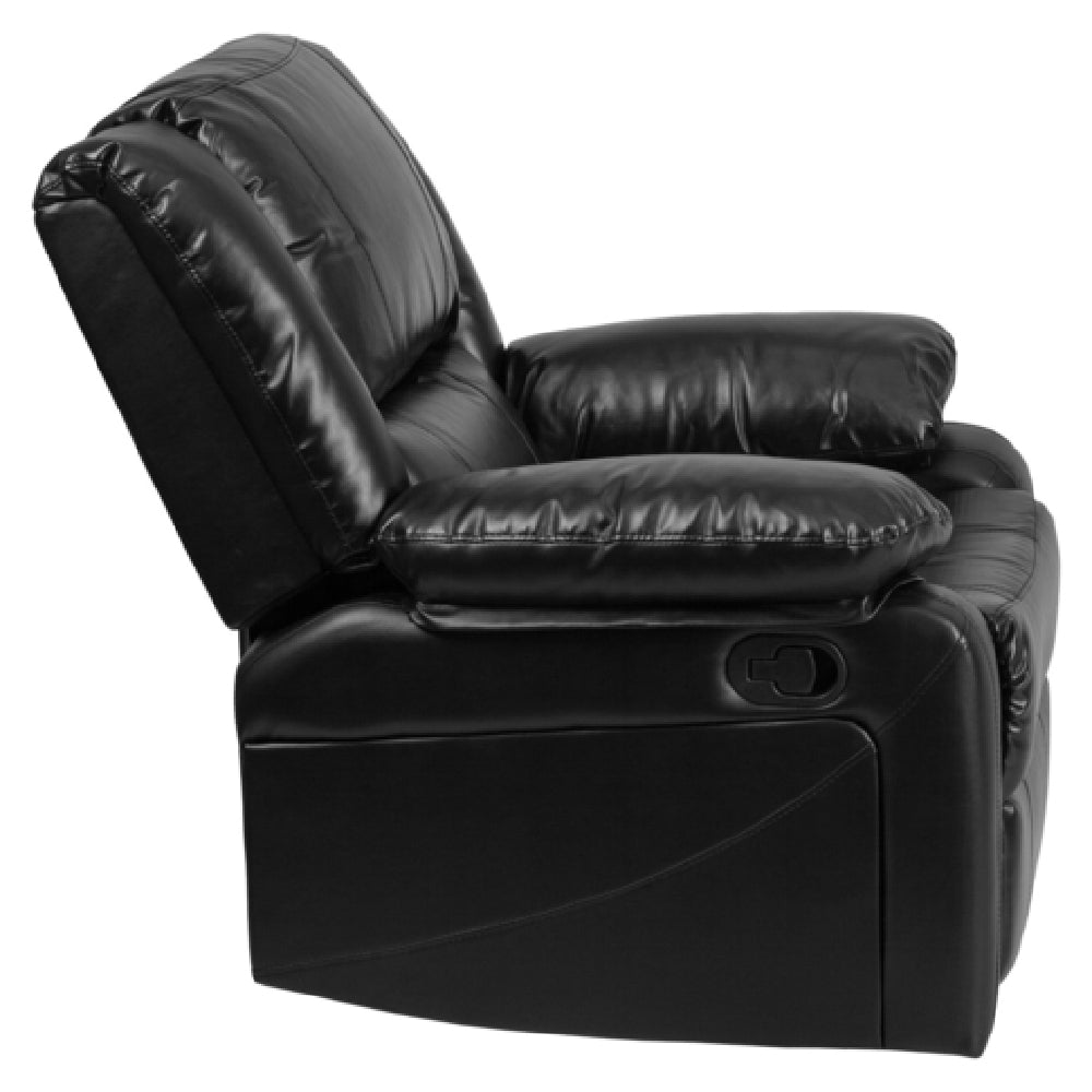 The Flash Furniture BT-70597-1-GG Harmony Series Recliner is a contemporary designed seat, measuring 36" wide, 37" to 64" deep, and 38" high, offering a blend of style and comfort. This recliner stands out with its upholstered pillow back cushions and seat, providing plush comfort complemented by plush upholstered arms. Featuring a recessed lever, it allows users to easily adjust the seat position while maintaining an 8" distance between the fully reclined position and the wall, which is ideal for space-conscious environments. The recliner incorporates CA117 fire retardant foam, ensuring safety without compromising comfort. Upholstered in LeatherSoft, a combination of leather and polyurethane, it delivers a soft yet durable finish that is simple to maintain. Available in black, this recliner requires assembly, making it a versatile choice for living spaces, offices, or commercial environments. In-stock items typically ship within 24 hours, promising prompt delivery. The Flash Furniture BT-70597-1-GG Harmony Series Recliner is a functional and stylish addition, serving various market segments ranging from home use to professional settings, where comfort meets contemporary design.