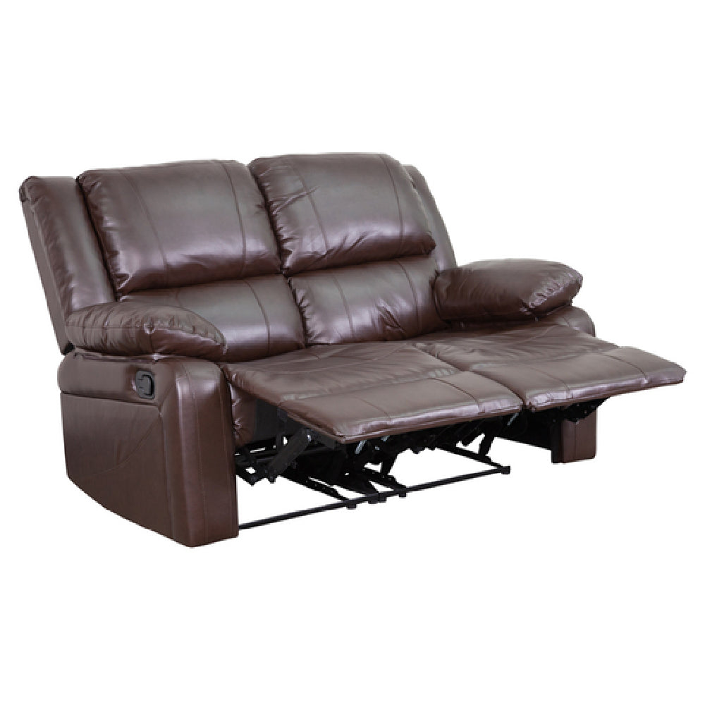 The Flash Furniture BT-70597-LS-BN-GG Harmony Series Loveseat is a contemporary piece designed to deliver both comfort and style. With dimensions of 56" wide, 35" - 64" deep, and 38" high, this loveseat is perfect for various living spaces. It features dual built-in recliners, allowing users to relax with ease. Upholstered pillow back cushions and plush upholstered arms enhance the seating experience, while the LeatherSoft material, a blend of leather and polyurethane, ensures durability and comfort. The recessed levers add to its sleek design, and the loveseat requires an 8" distance from the wall to fully recline. Safety is prioritized with CA117 fire retardant foam, providing peace of mind. The product comes in a stylish brown finish and requires assembly upon arrival. Shipped in two boxes, in-stock items typically dispatch within 24 hours, making it a convenient and timely choice for those seeking immediate furniture solutions. This loveseat appeals to a wide range of consumers, from those furnishing a modern apartment to commercial spaces needing functional yet stylish seating options.
