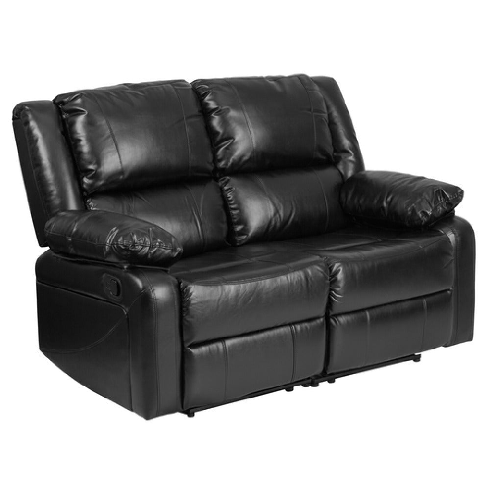 The Flash Furniture BT-70597-LS-GG Harmony Series Loveseat is a contemporary seating solution featuring two built-in recliners, making it a sophisticated addition to any space. With dimensions of 56"W x 35"-64"D x 38"H, it is designed to fit comfortably in various settings while providing ample seating space. The loveseat's unique value proposition lies in its combination of style and practicality, appealing to both residential and commercial markets. It is upholstered with LeatherSoft, a blend of leather and polyurethane, offering a soft yet durable finish. The plush upholstered pillow back cushions and arms enhance comfort, while the recessed levers facilitate easy reclining without compromising on design. An 8" distance is required between the full recliner and the wall, ensuring efficient use of space. Safety is prioritized with CA117 fire retardant foam, providing peace of mind in compliance with safety standards. Assembly is required, and the product is conveniently shipped in two boxes, usually within 24 hours for in-stock items. The Harmony Series Loveseat brings a blend of modern aesthetics and functional comfort, making it an attractive choice for various environments, from stylish living rooms to professional waiting areas.