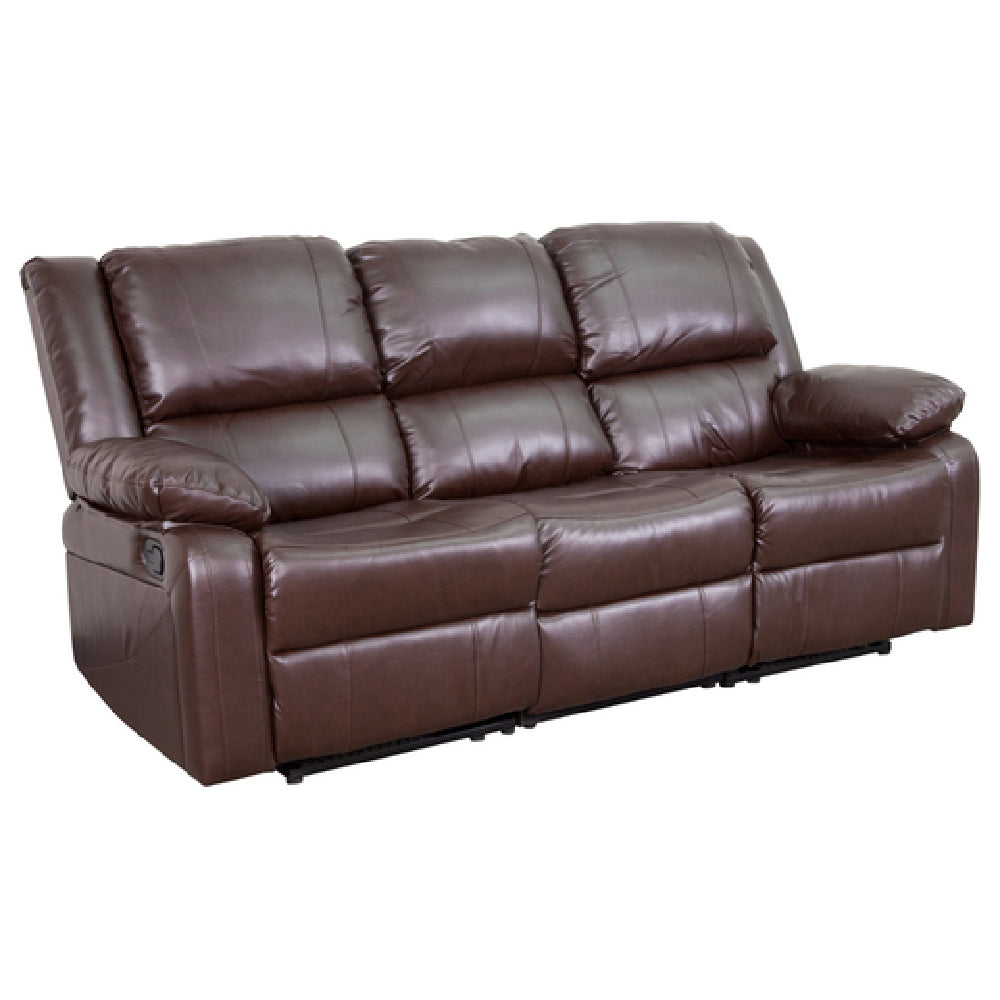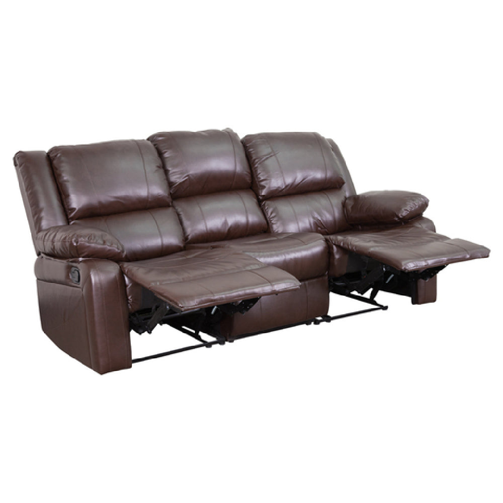 Flash Furniture BT-70597-SOF-BN-GG Harmony Series Sofa is a contemporary seating solution designed for comfort and functionality, featuring technical specifications that cater to various market segments within the furniture industry. Measuring 77 inches in width, with a depth range from 35 to 64 inches and a height of 38 inches, this sofa is engineered to fit a range of living spaces. A unique feature includes two built-in recliners, enhancing user comfort with an 8-inch clearance from the wall when fully reclined. The sofa's construction incorporates CA117 fire retardant foam for increased safety, while the LeatherSoft upholstery provides a plush seating experience with its pillow back cushions and upholstered seat. The plush upholstered arms add to the comfort, and recessed levers ensure a smooth reclining mechanism. This product is available in a sophisticated brown color and requires assembly, shipping in three boxes, which facilitates handling and delivery. Typically, in-stock items ship within 24 hours, demonstrating the brand's commitment to efficiency. This versatile piece is suitable for both residential and commercial settings, where contemporary design and user safety are priorities, making it a valuable addition to any space.
